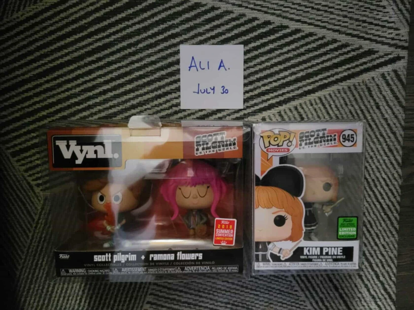 Two collectible figures from Scott Pilgrim vs. the World. Includes the VNYL Scott Pilgrim + Ramona Flowers 2-pack and the Funko Pop! Movies Kim Pine (945), a limited edition exclusive. Perfect for collectors!