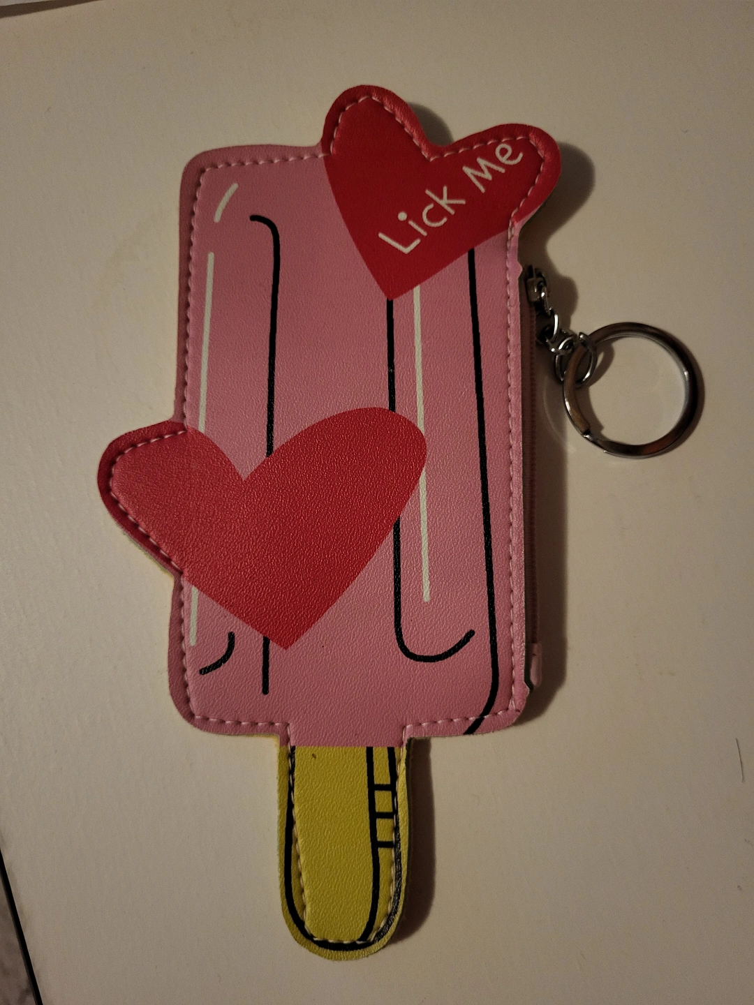Cute coin purse shaped like a popsicle with a red heart that says 'lick me'. Has a zipper closure and a key ring for backpacks for bags.