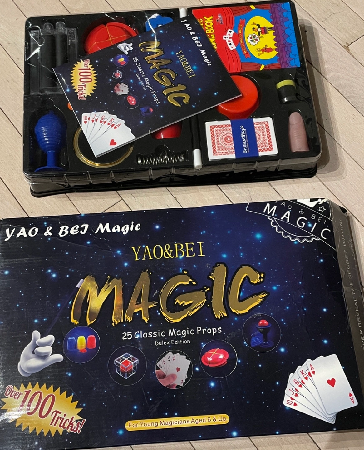 Magic set includes 25 classic magic props. Over 100 tricks! For young magicians aged 6 and up. Never used. Box has damage.