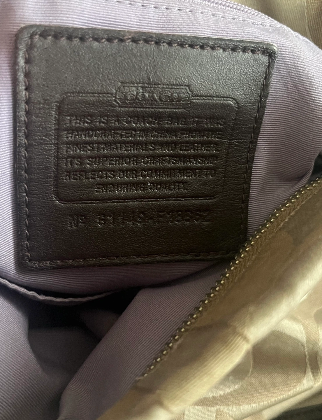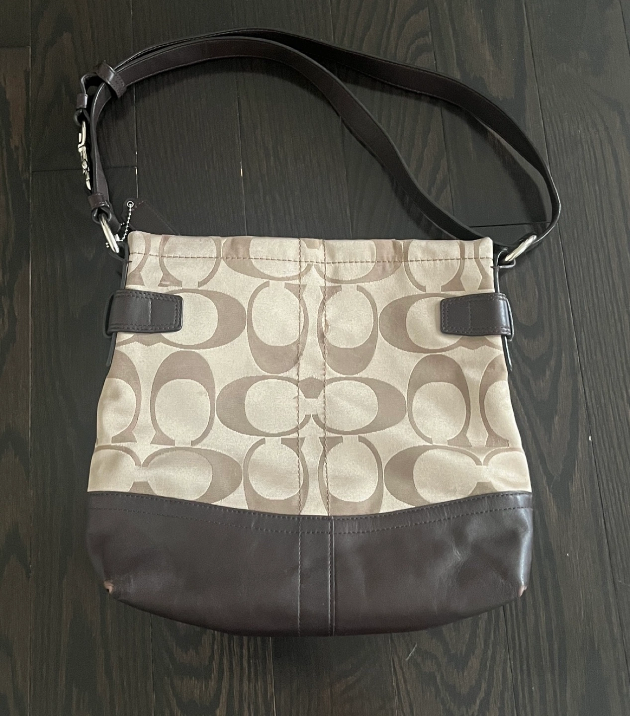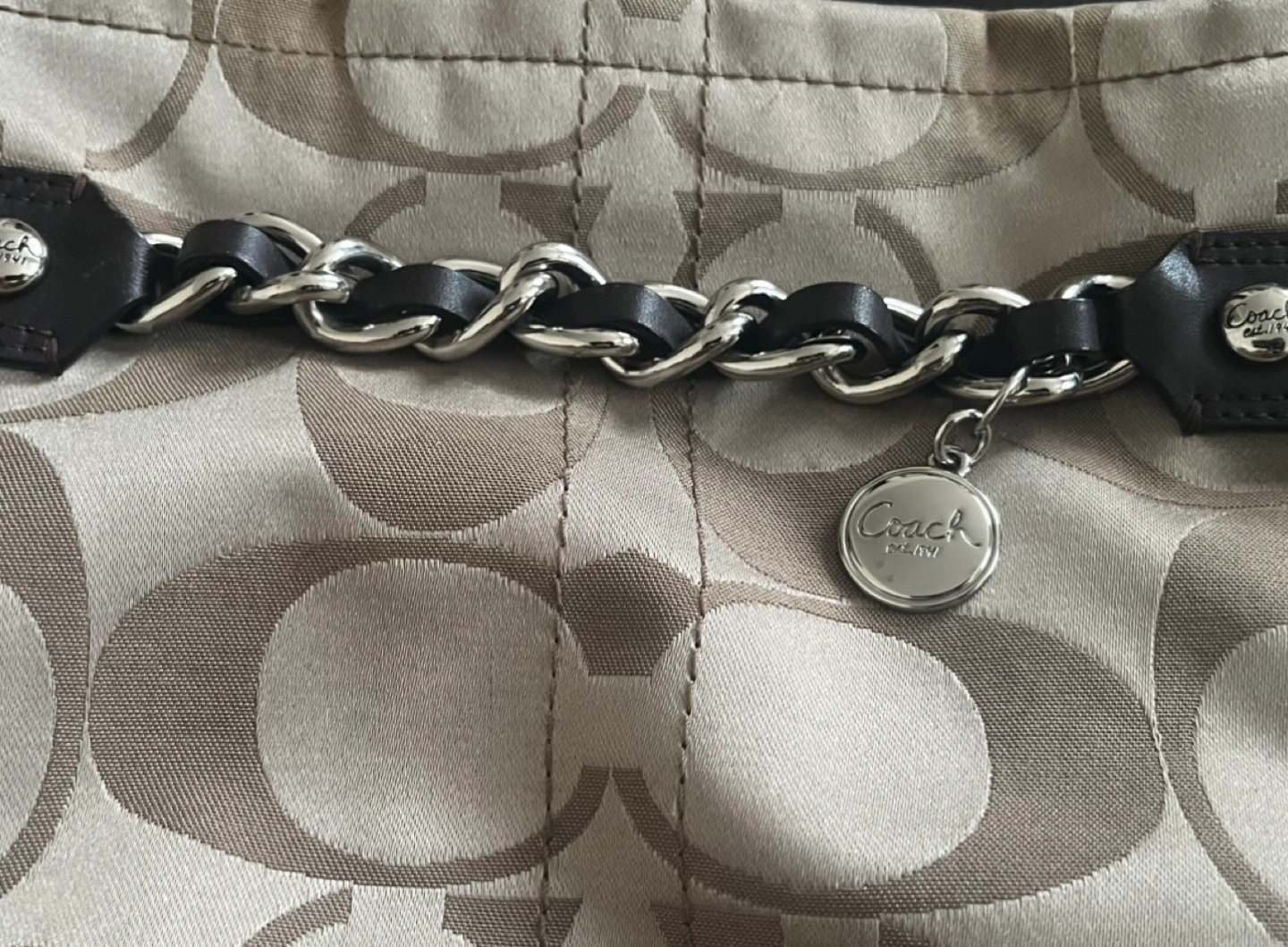 Tan and brown Coach bag with a long strap. The bag has a signature C pattern.