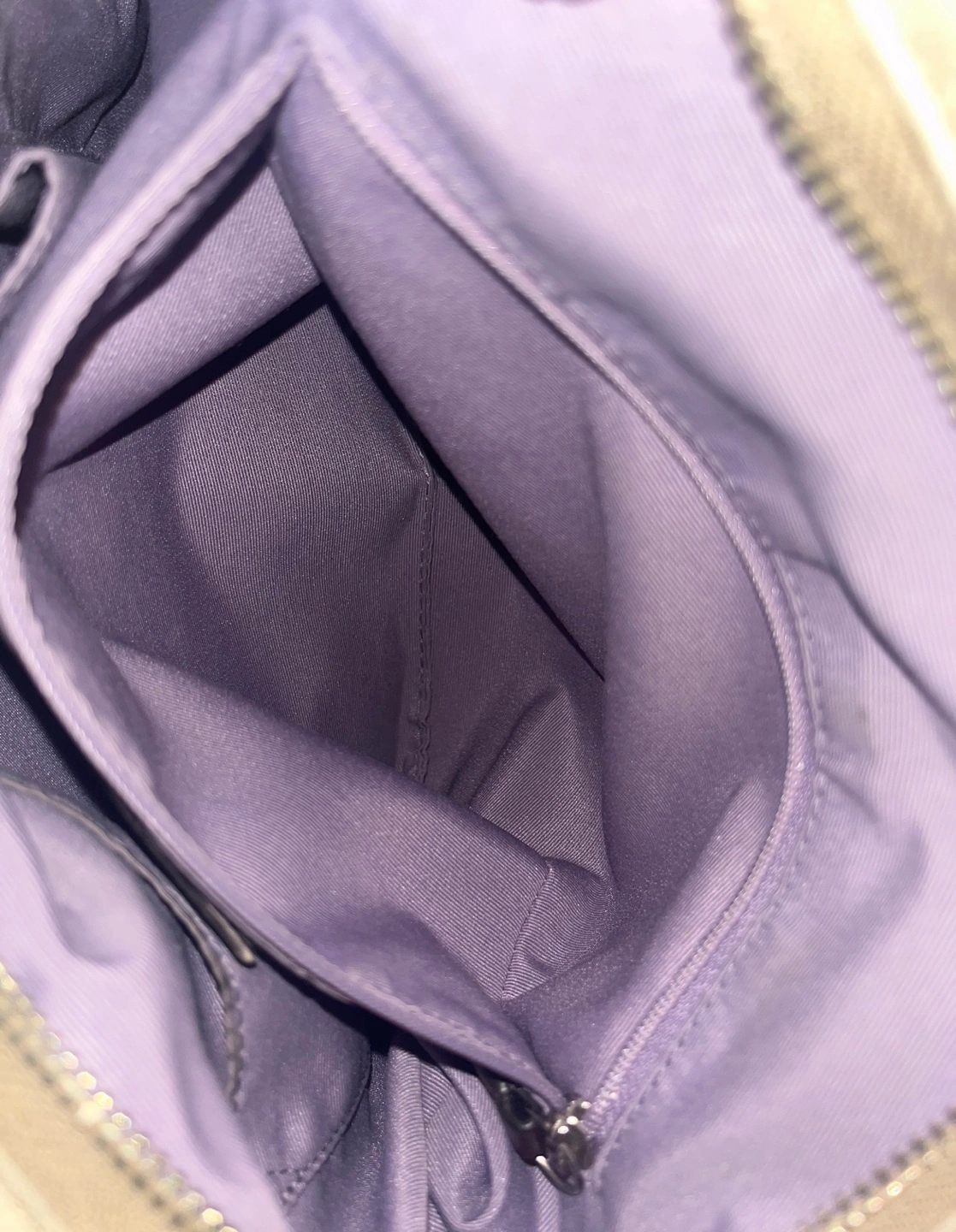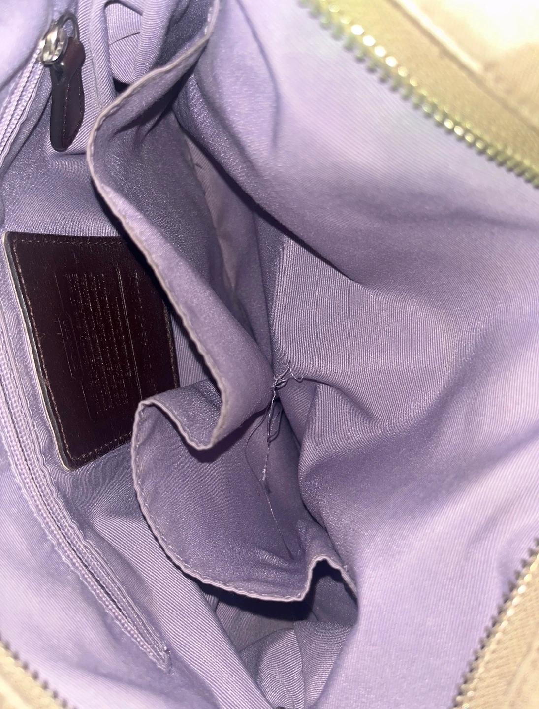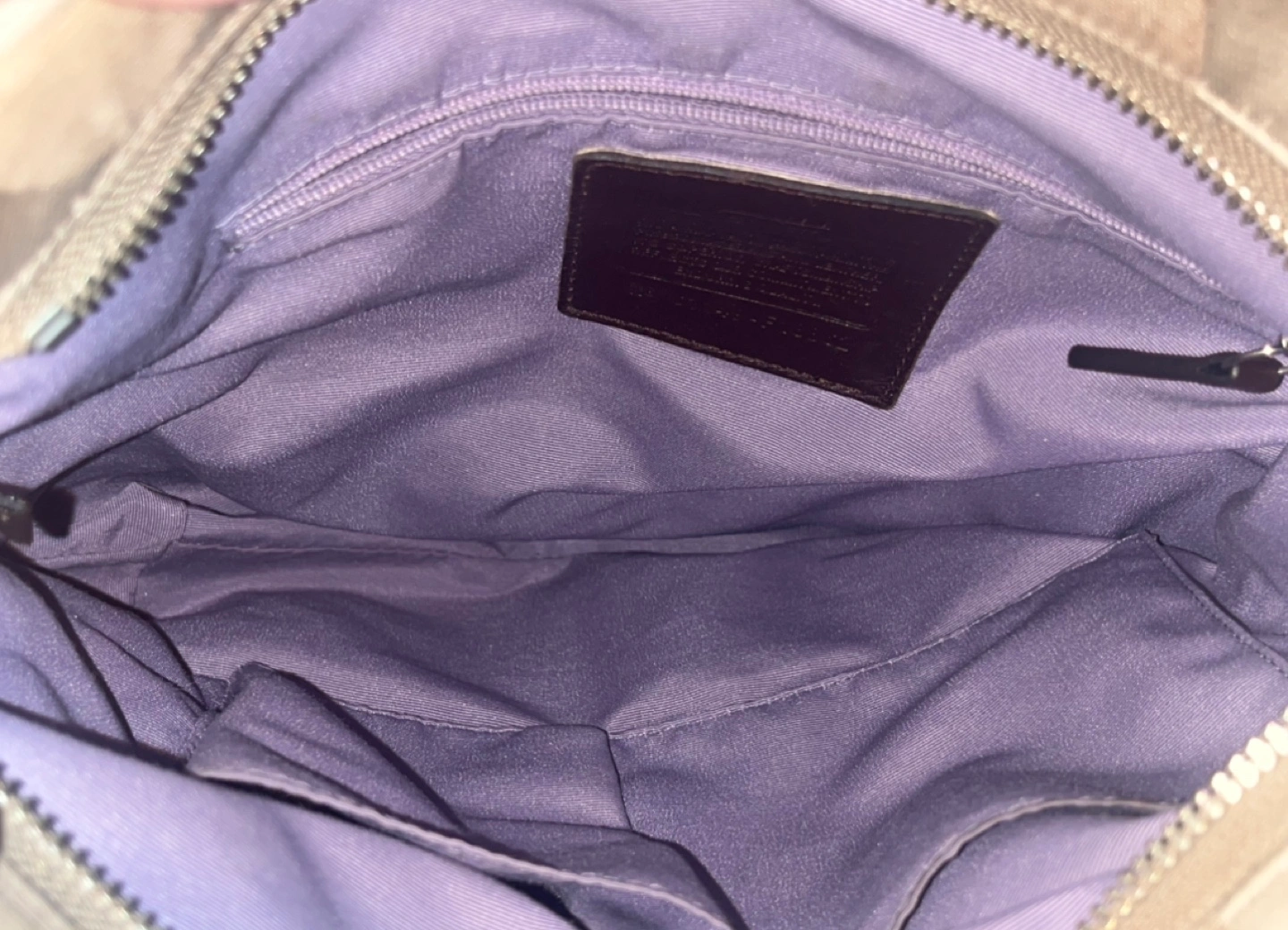 Tan and brown Coach bag with a long strap. The bag has a signature C pattern.