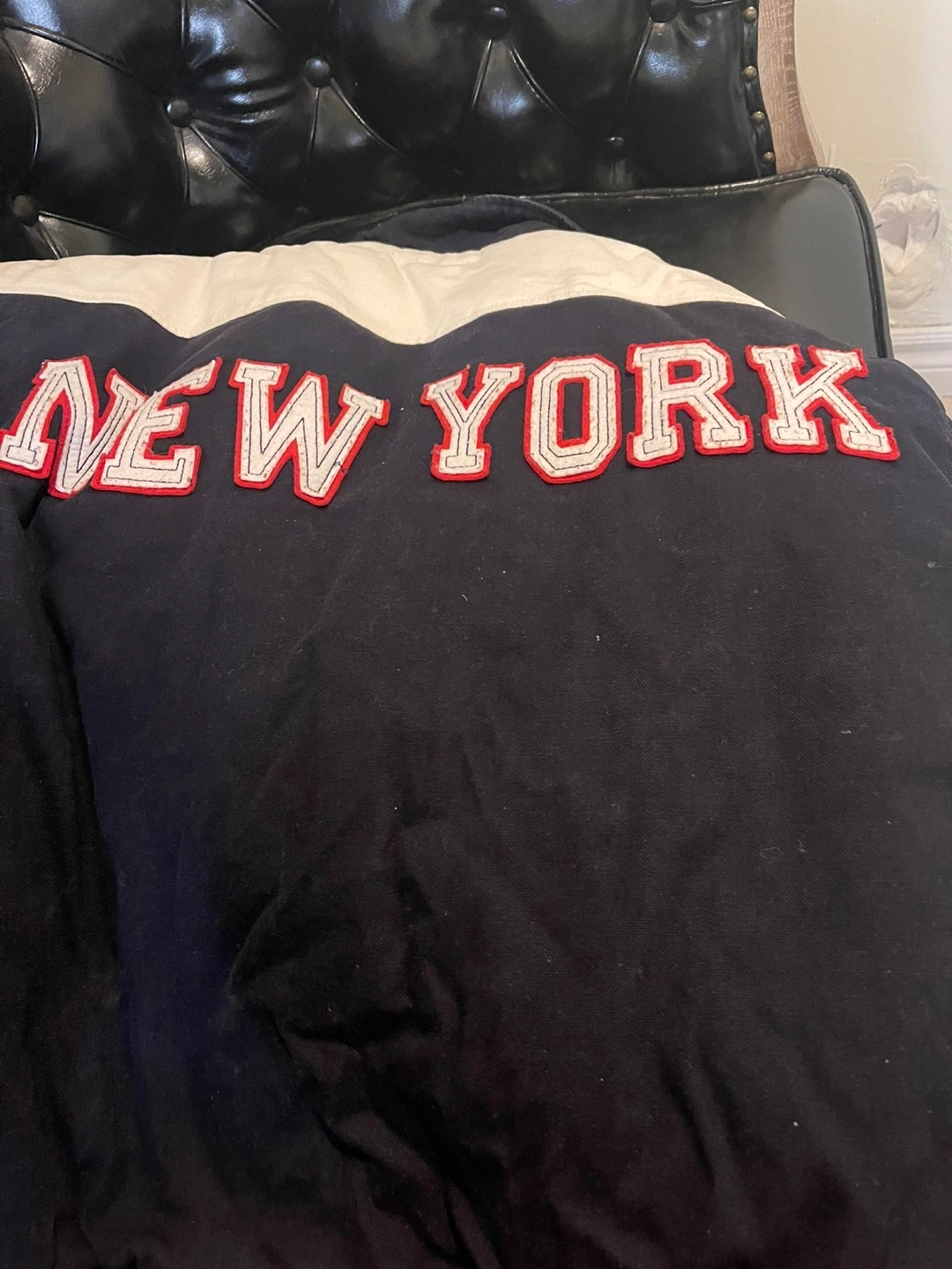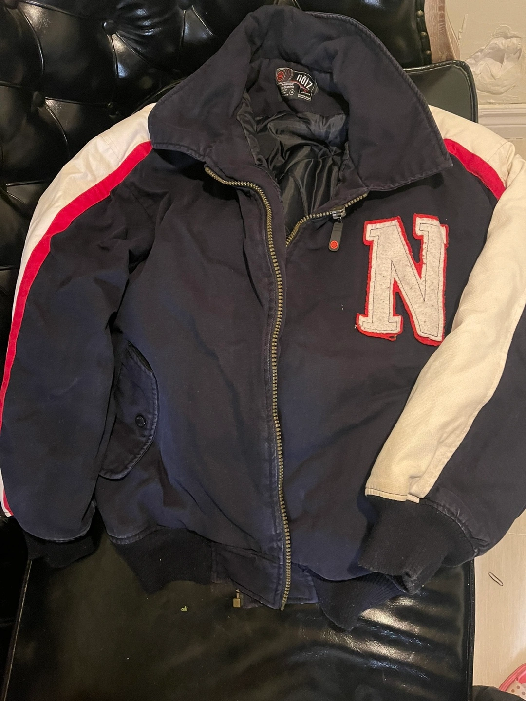 51Blue jacket with a red and white striped sleeve. Features a large 'N' on the back and a zipper closure.very warm