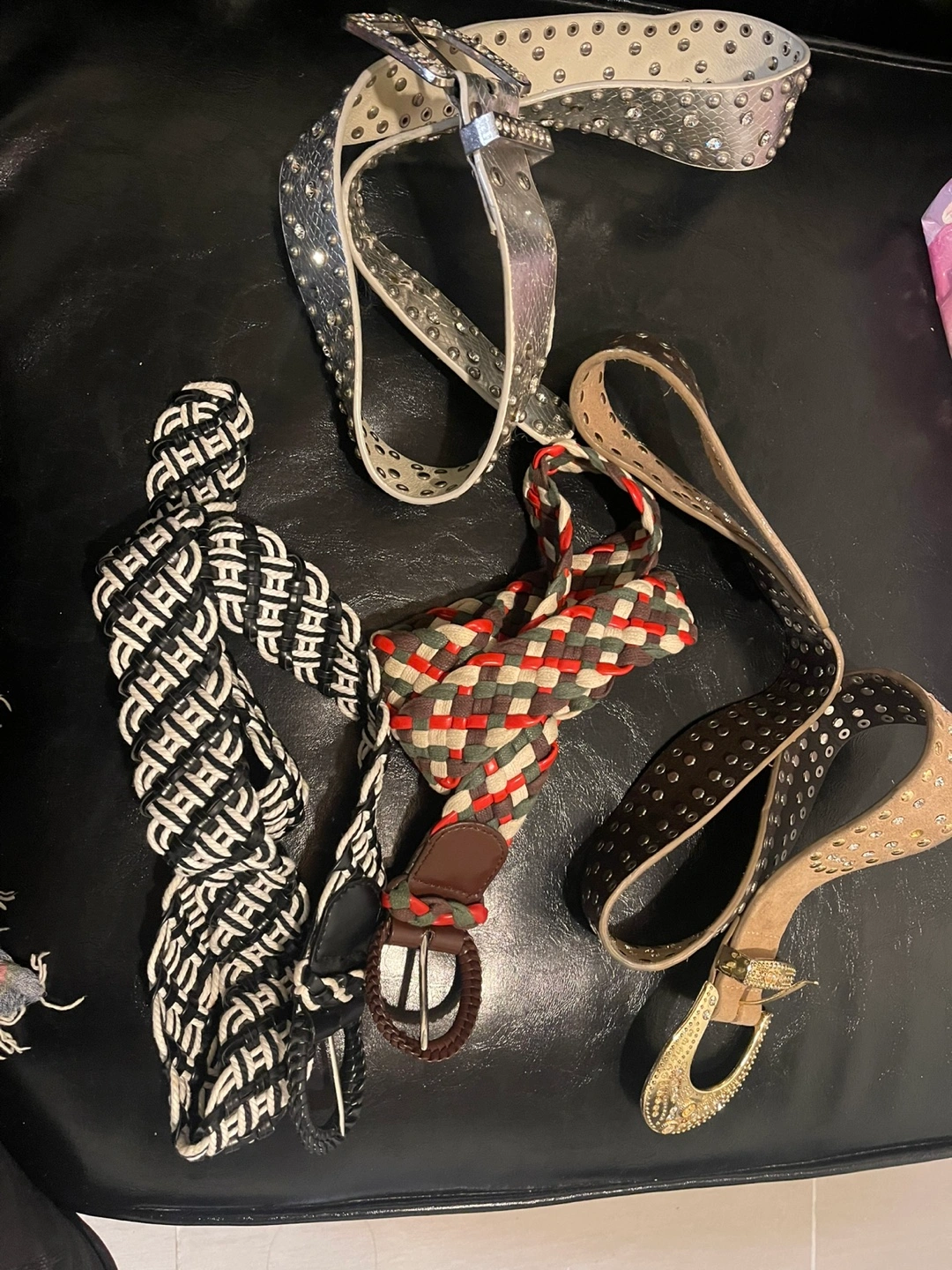 51Set of 4 belts. One black and white, one braided, one brown, one silver $3 each