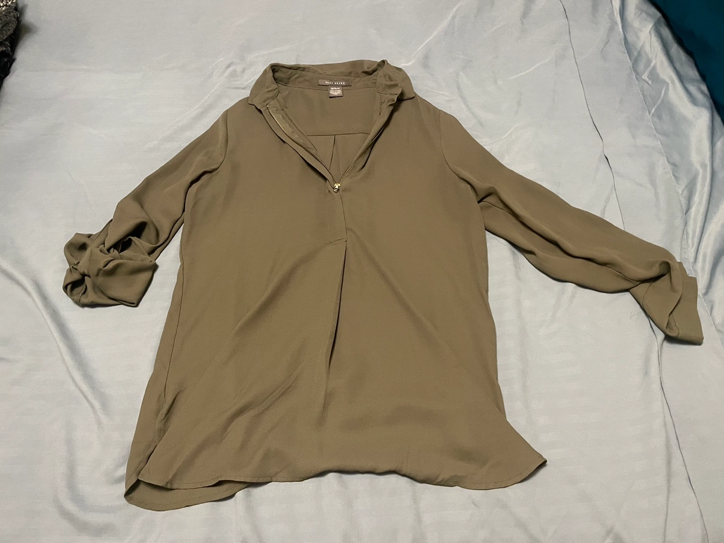 Long sleeve green blouse with a gold zipper. The blouse has a collared neckline and a relaxed fit.