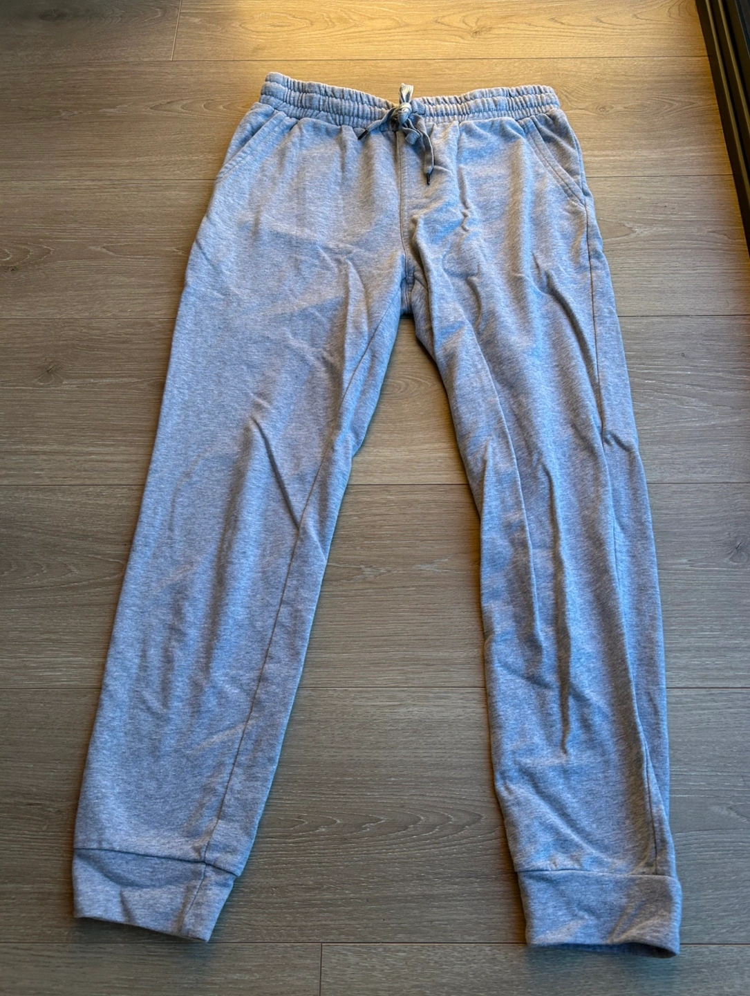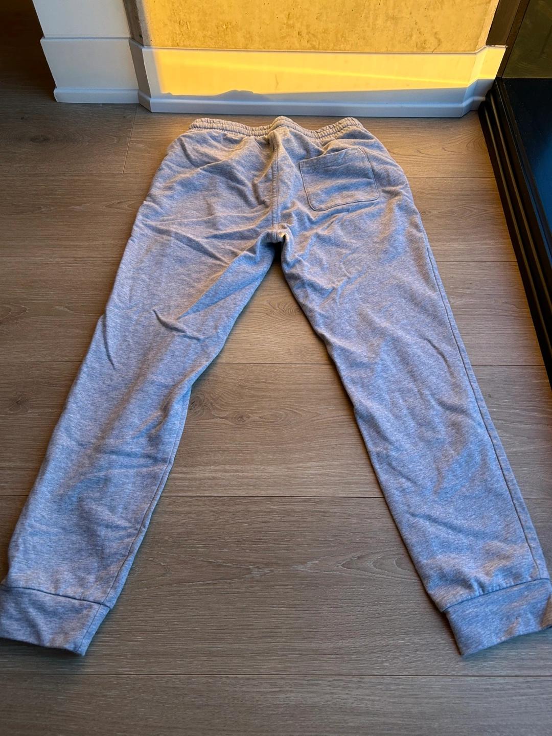Gray sweatpants with elastic waistband and drawstring. Two side pockets and one back pocket.