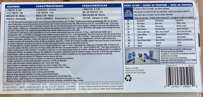 Revell Germany model kit. 1:25 scale Chevrolet 1956 Del Ray. Includes options to build a stock or customized car. Parts are still sealed and never opened! Features of this model included detailed engine and chassis, rubber tires, etc. Great as Christmas gift.