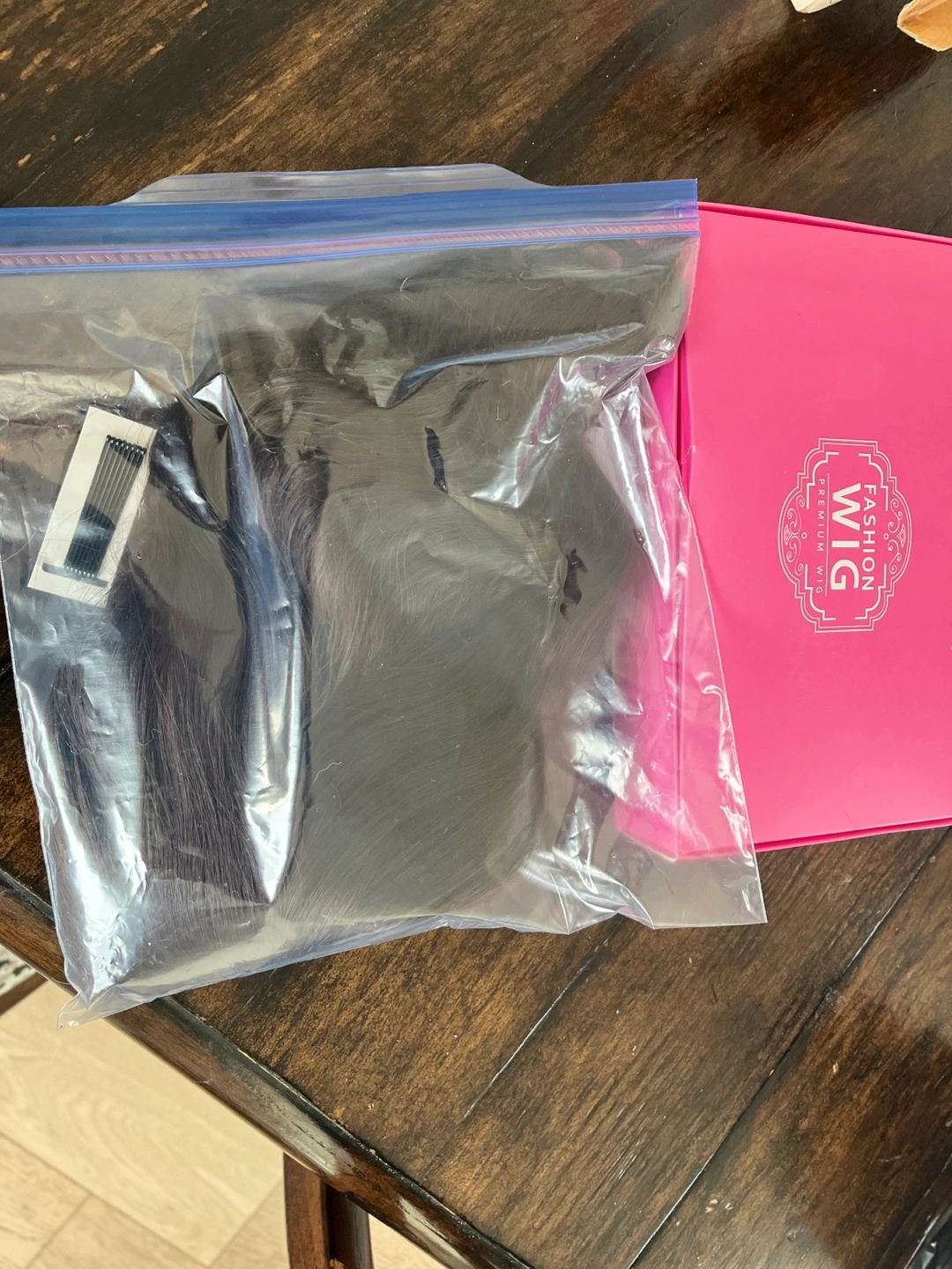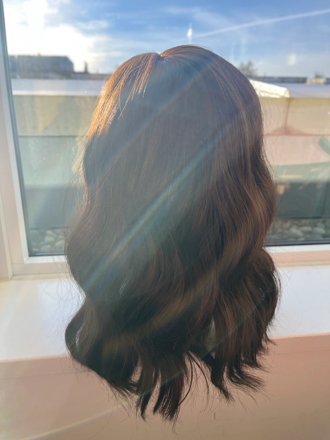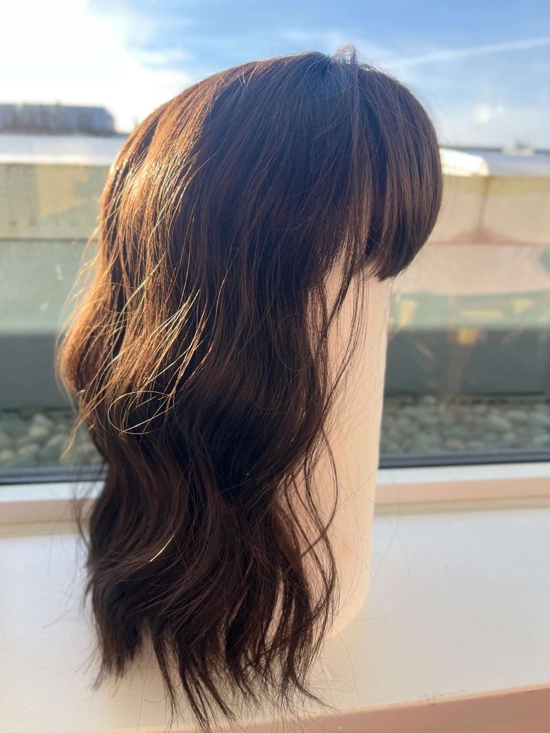 Brown wavy wig with bangs. Comes in a box and a bag. Totally New never worn excellent condition. With free eyelashes.