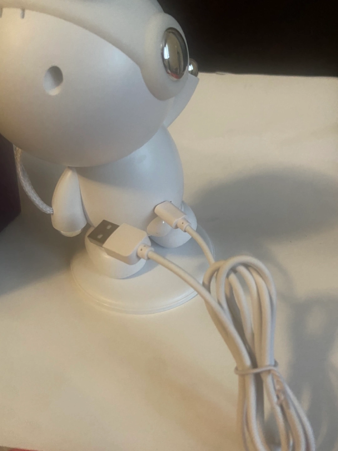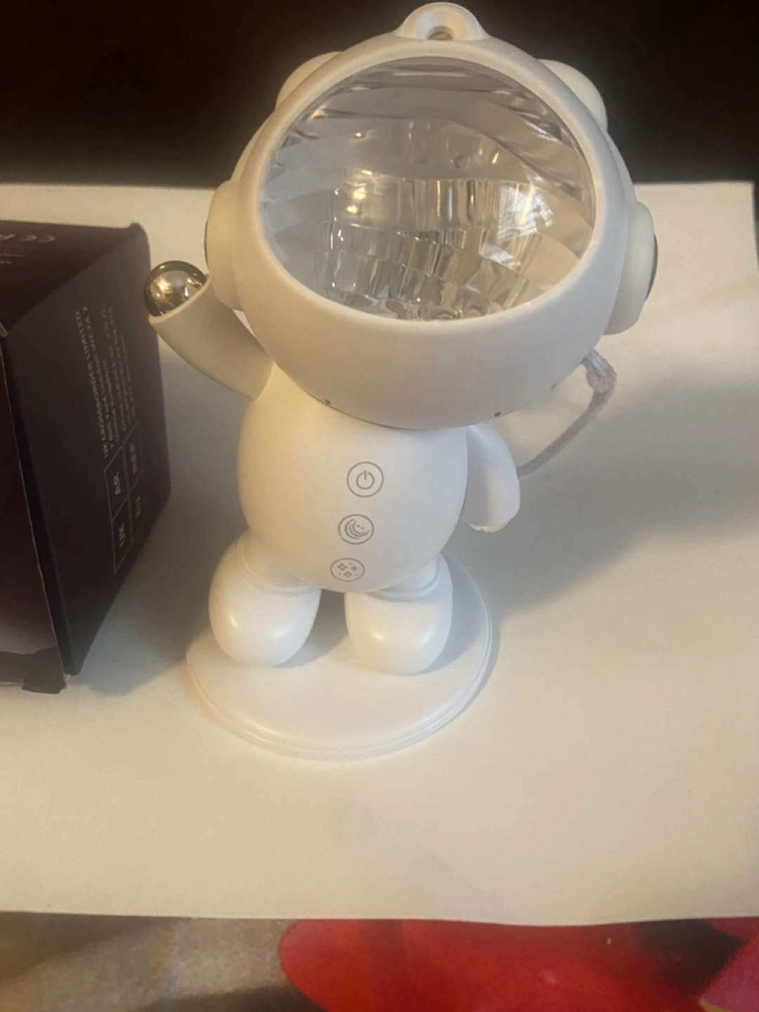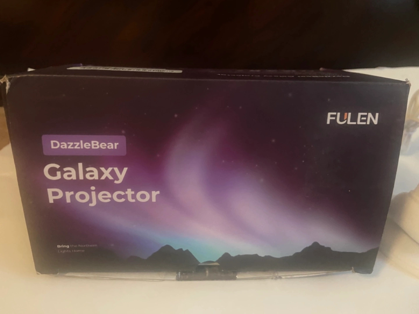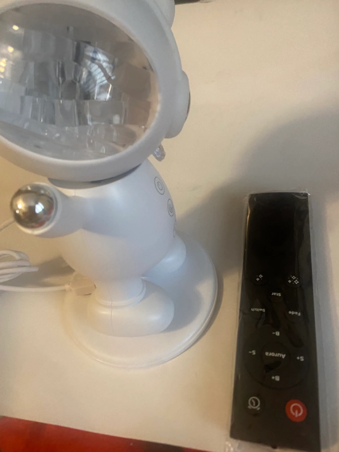 White galaxy projector. Includes a remote control. Can be powered with USB or a wall adapter. Has various light settings.