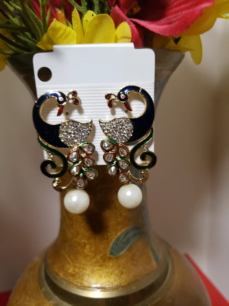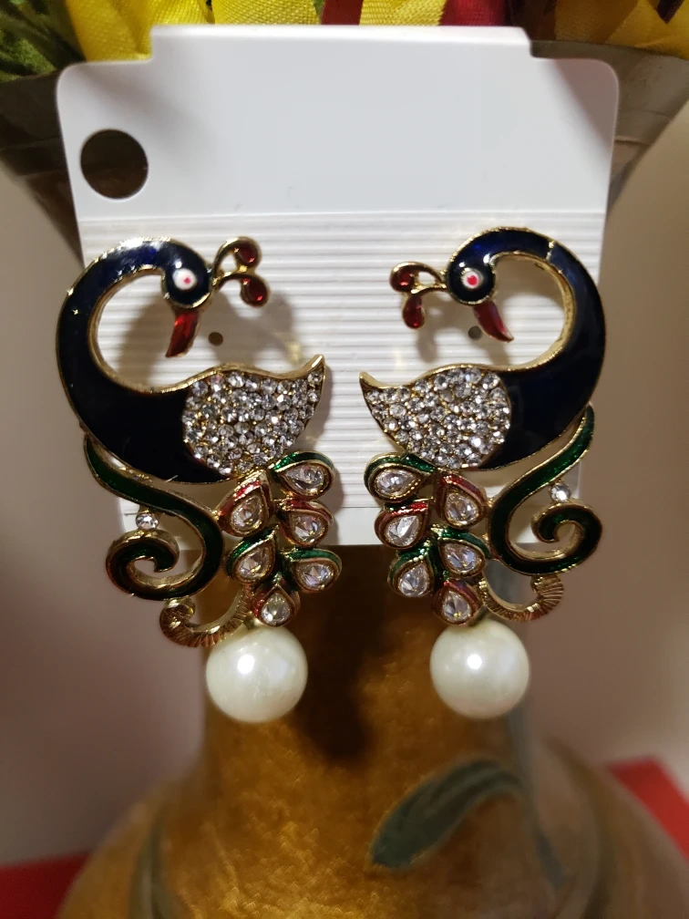 Beautiful peacock dangle earrings with pearl accents.