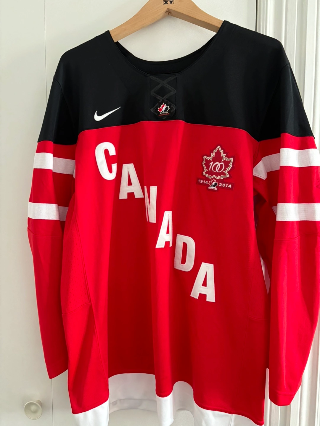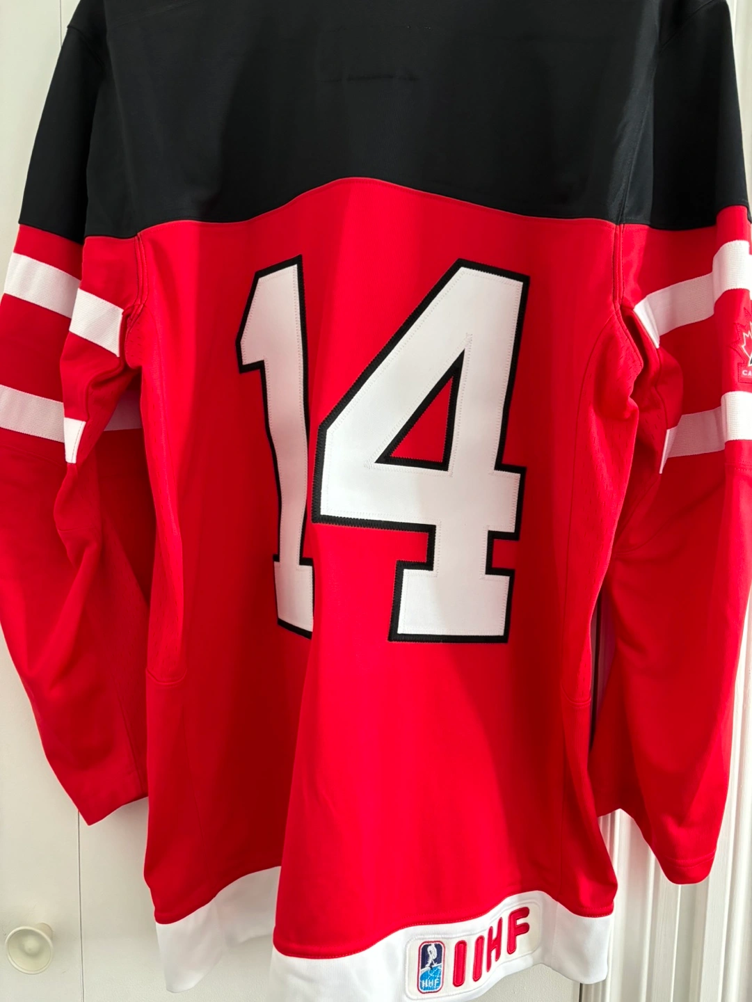 Get ready for the World Juniors! Men's Team Canada jersey, red and black with white accents, number 14 on the back, size large. 100th Anniversary patch. Authentic.