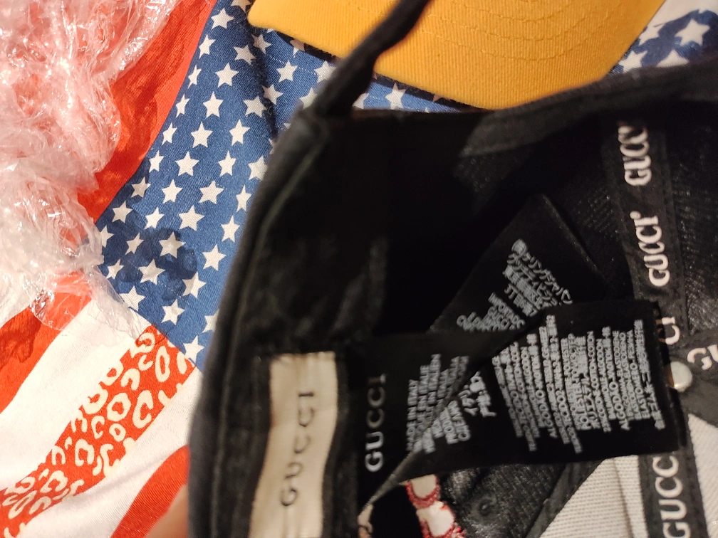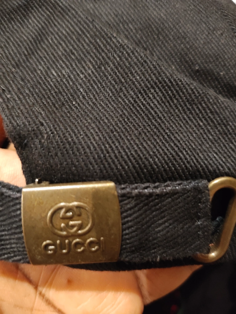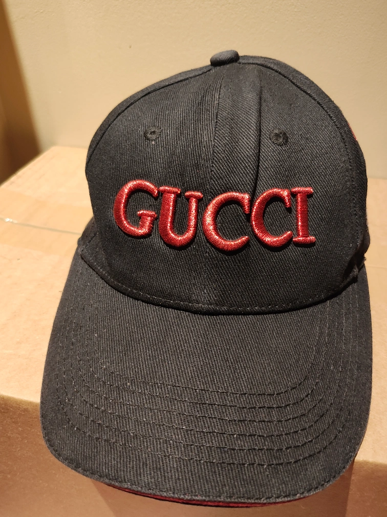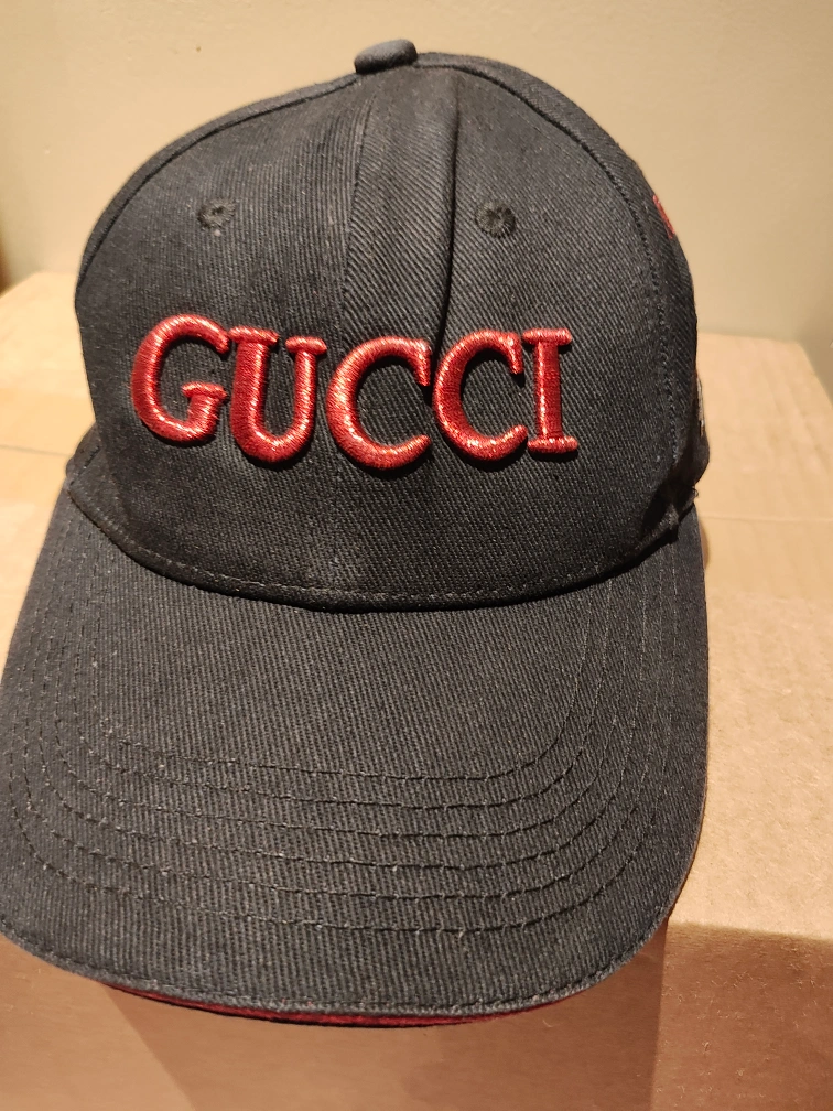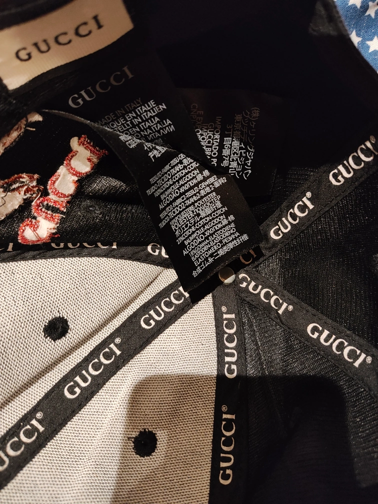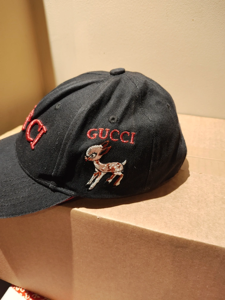 Black baseball cap with red embroidered Gucci logo and red and white deer embroidery on the side. Adjustable back strap with a Gucci buckle.