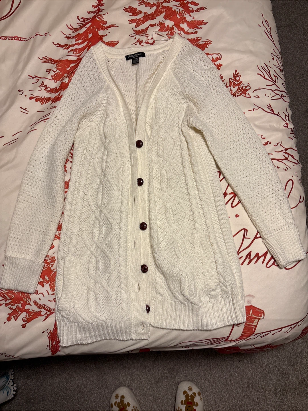 Selling a cozy Streetwear Society cardigan in size M/M. It's a cream colour with pleather accents on the elbows.