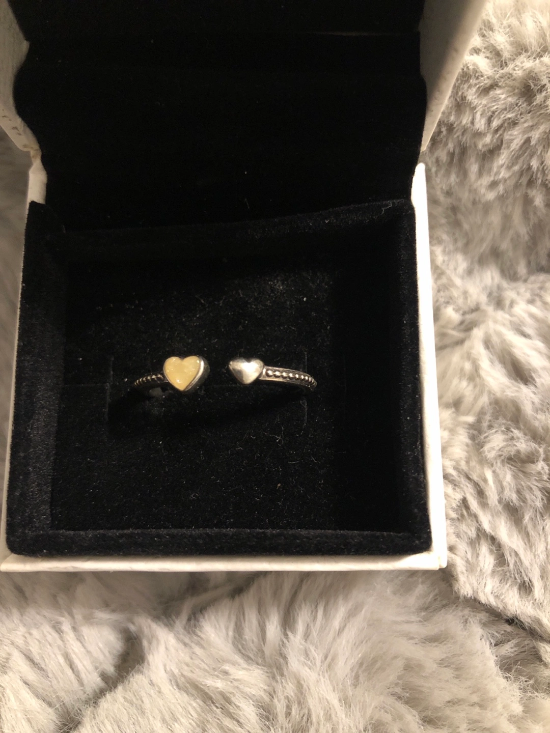 1000+925 Silver ring with two hearts. One heart is white enamel. Pandora size 58 / size 8.5