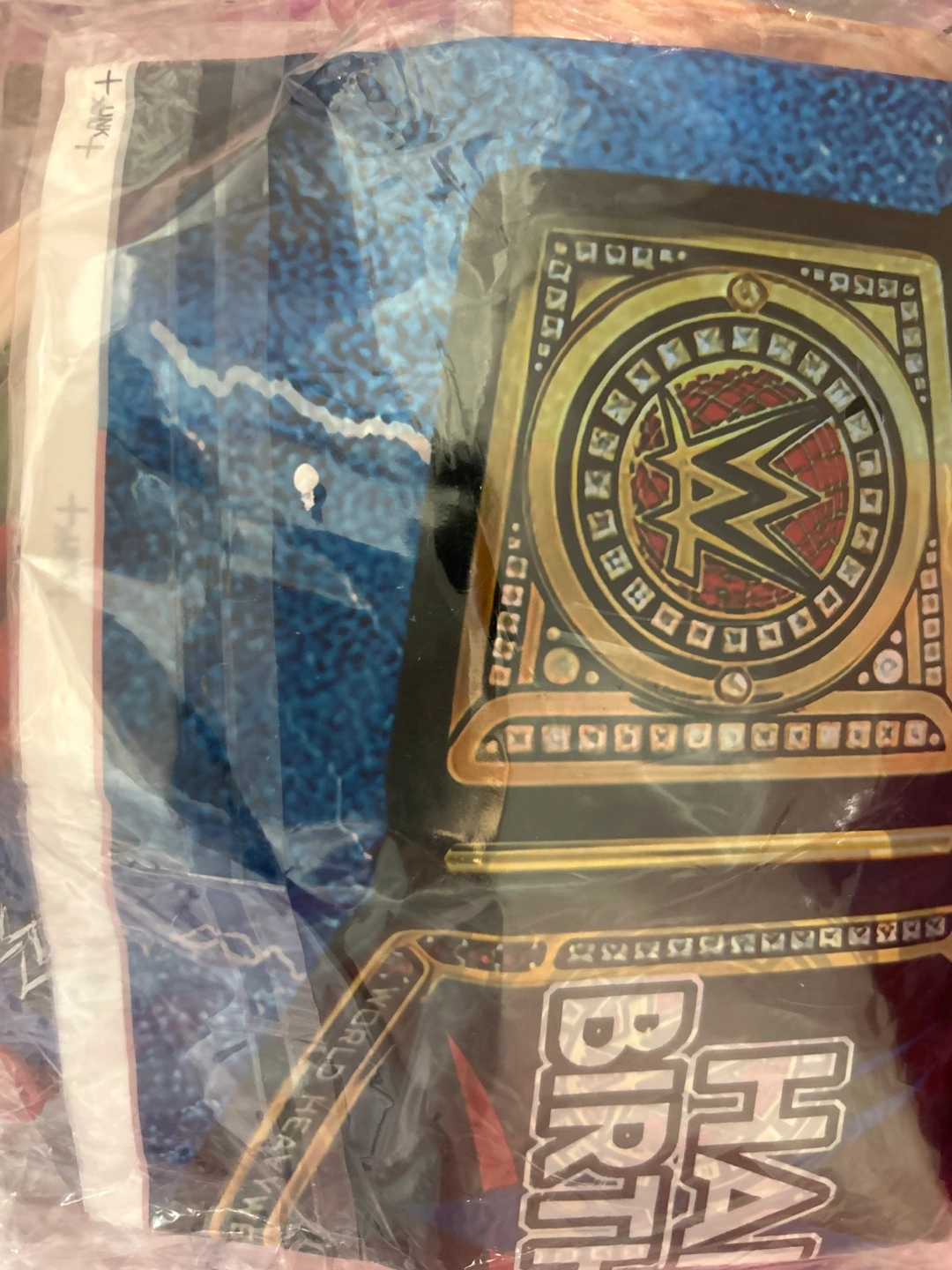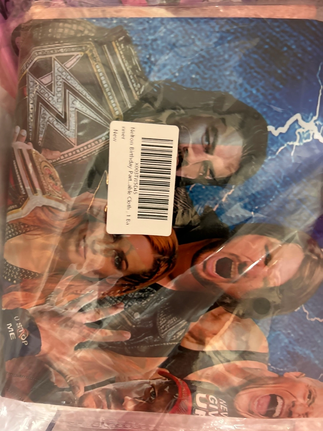 WWE themed birthday party set Features various wrestlers, including Roman Reigns, Becky Lynch, and John Cena.