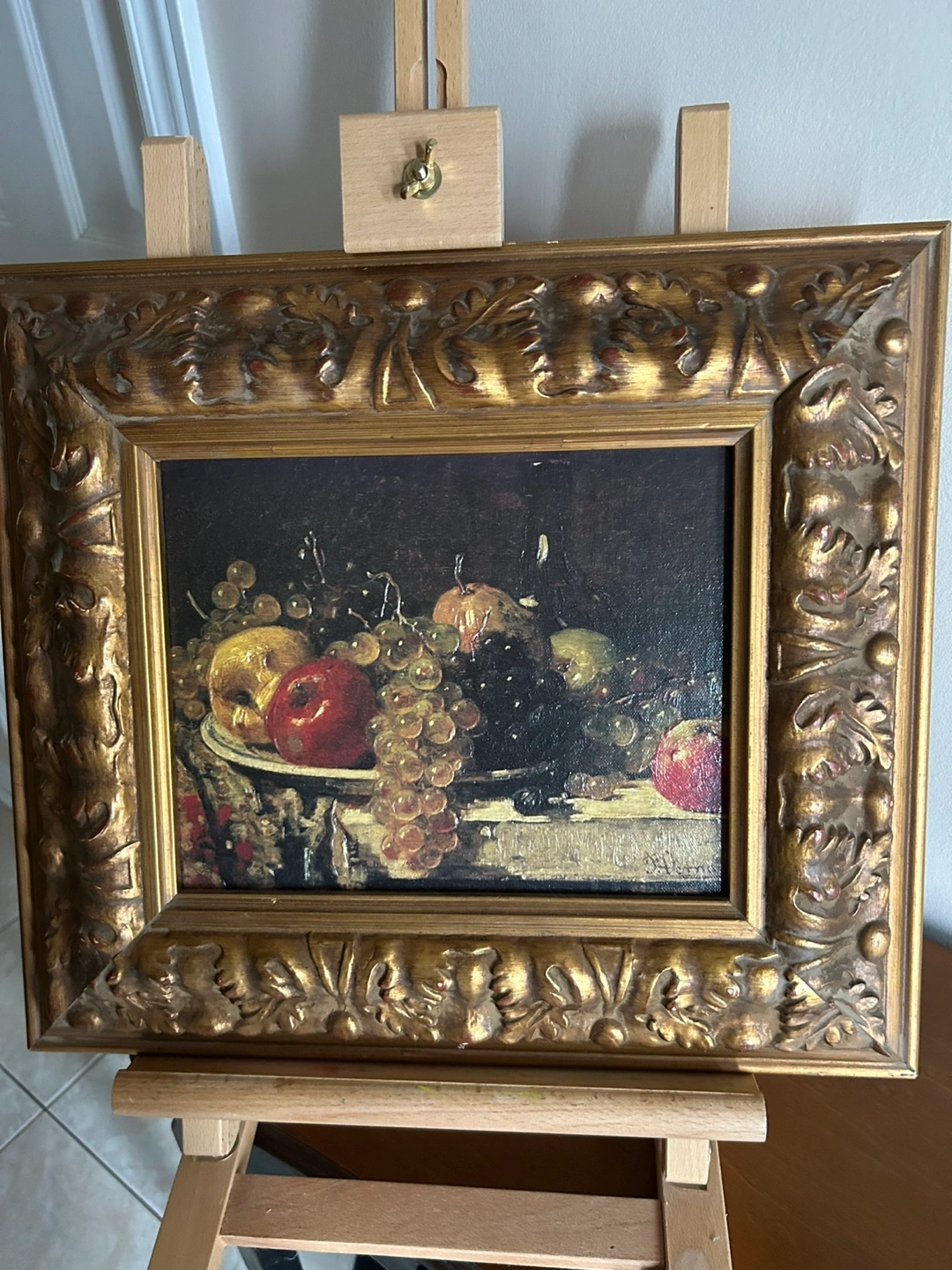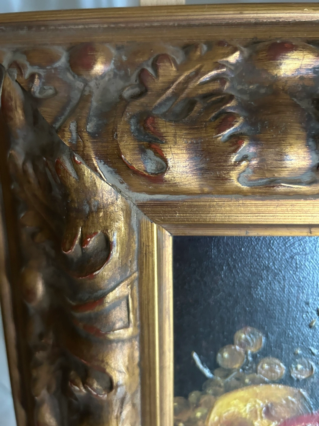 53Framed oil painting of a fruit still life. Ornate gold frame. Ready to hang. W-16” H-14.5” D-2.5”