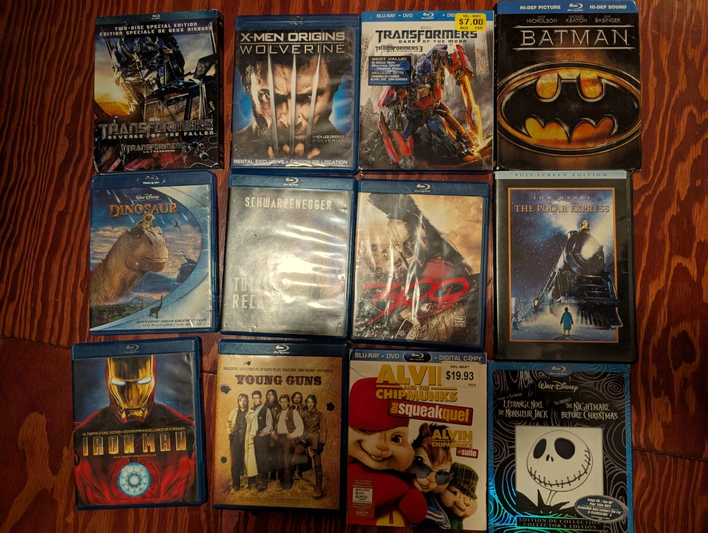 Collection of Blu-ray discs. Includes titles such as Transformers, Casino Royale, Valkyrie, Star Trek, Alice in Wonderland, The Incredible Hulk, The Dark Knight, X-Men Origins: Wolverine, Transformers, Batman, Dinosaur, Terminator Salvation, The Polar Express, Iron Man, Young Guns, Alvin and the Chipmunks: The Squeakquel and The Nightmare Before Christmas.
