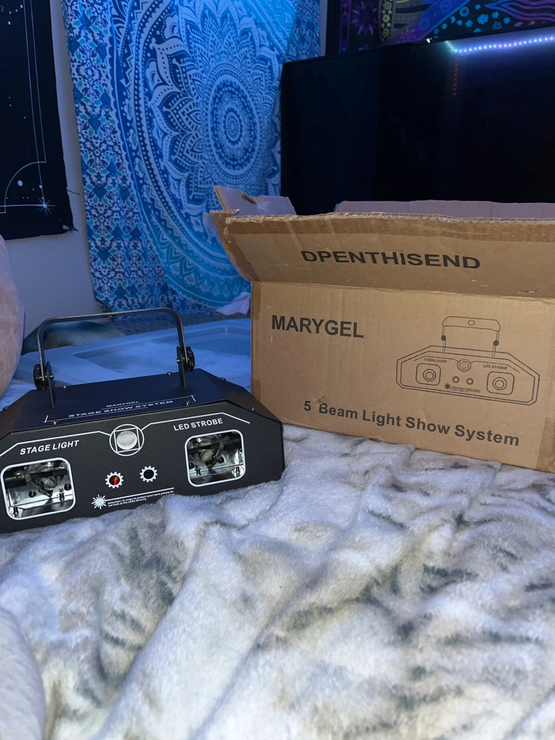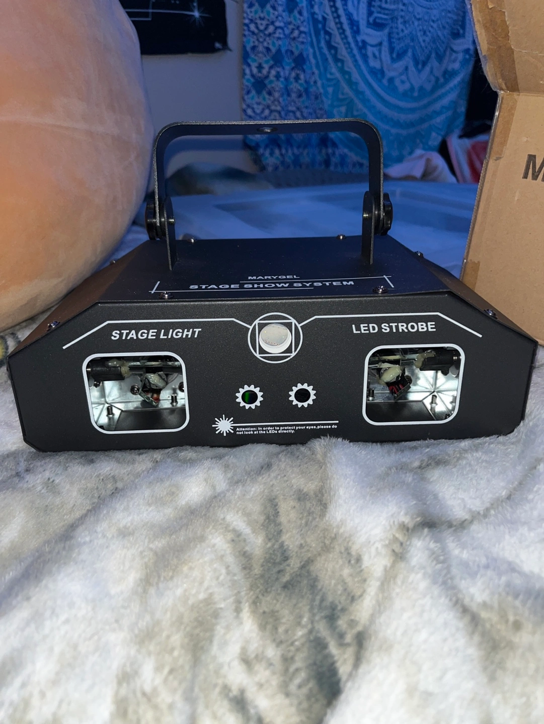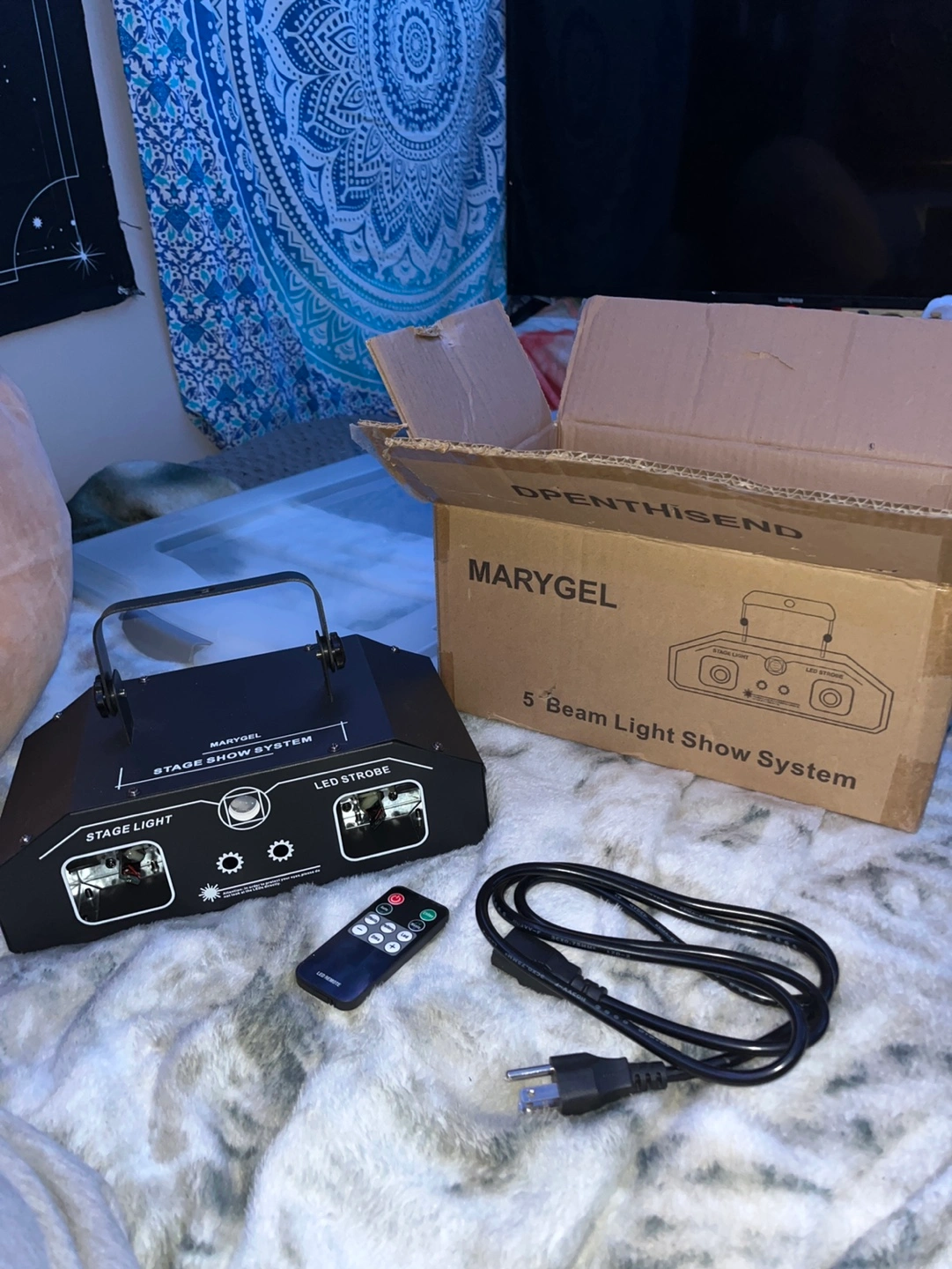Stage light show system with remote control and power cable. Includes original box and packaging.