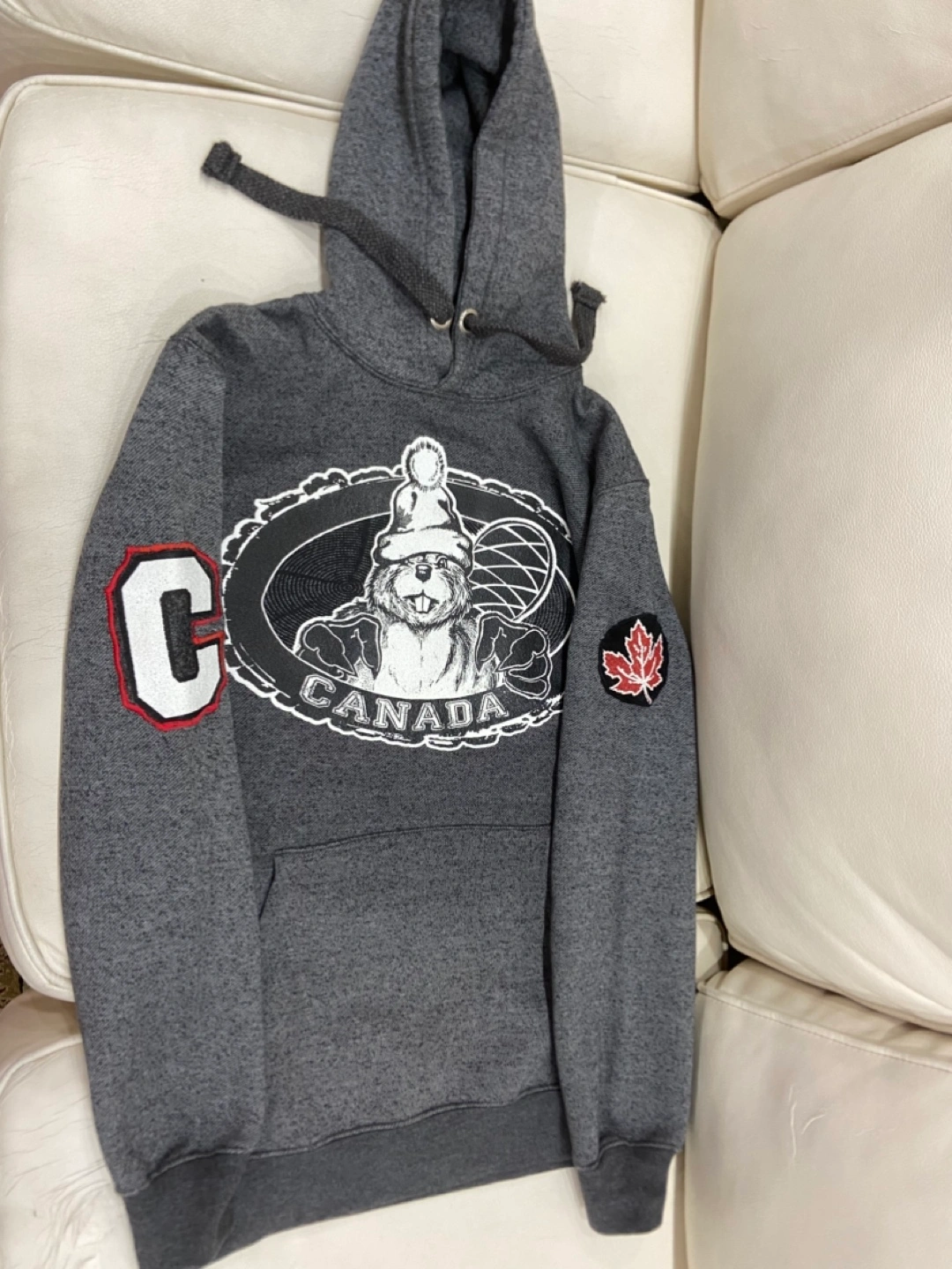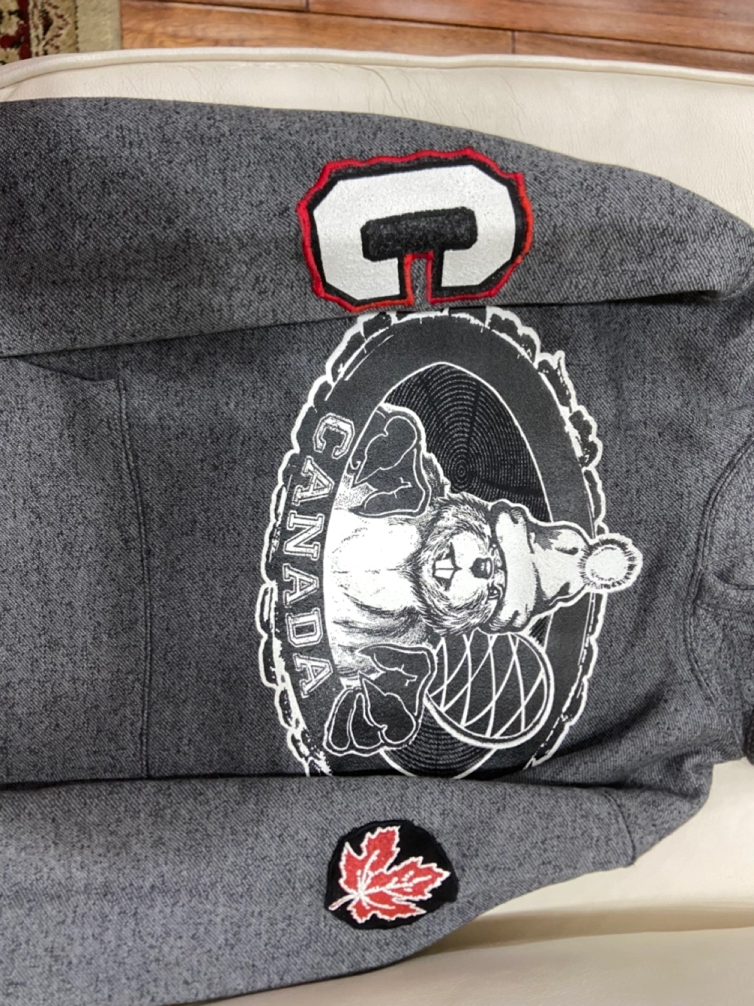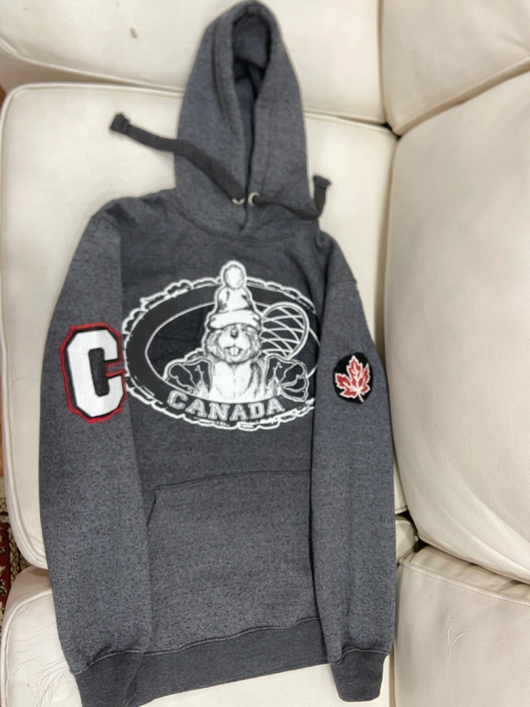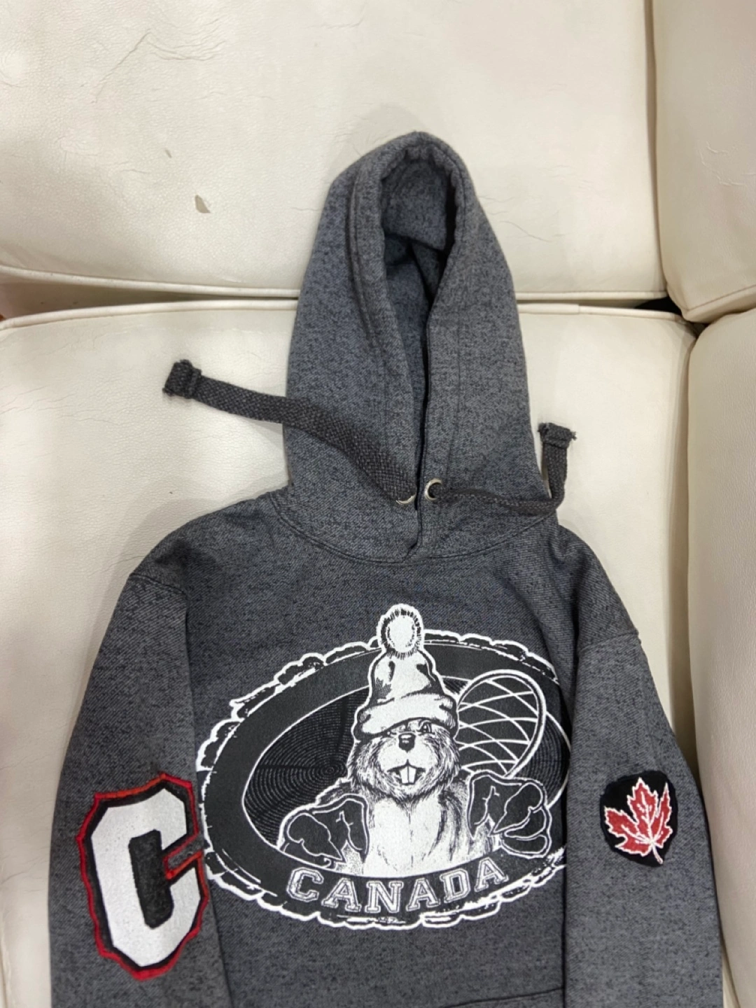 Grey hoodie with a beaver design and patches. Size S to m warm thick