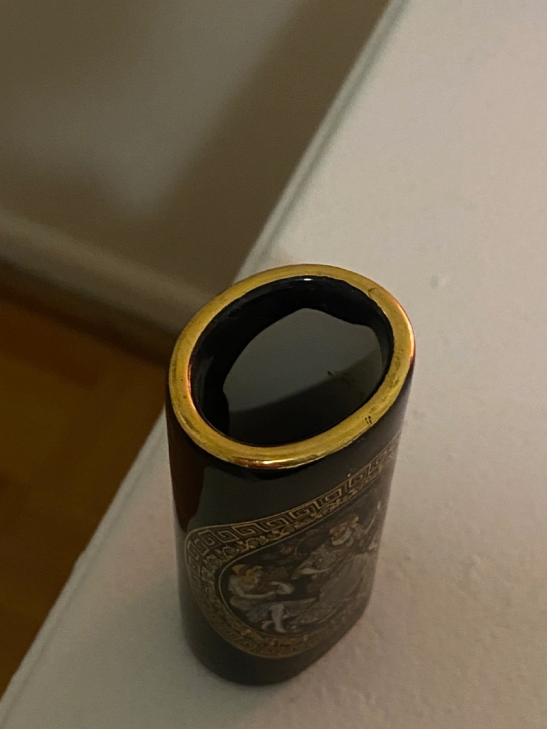 Small, black and gold Greek-themed decorative vase. Features detailed artwork with a Greek theme on the front and a gold border around the edge. About 2.8 inches tall.