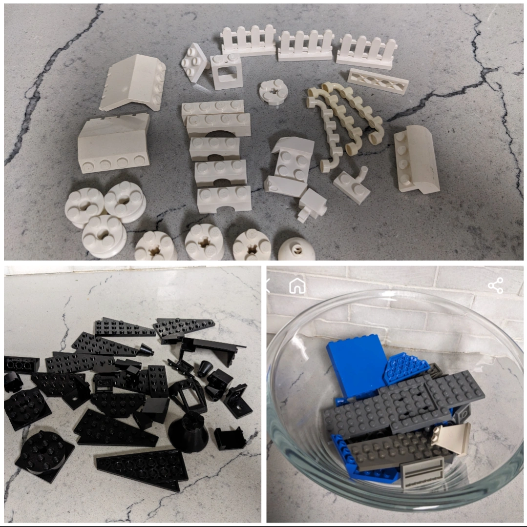 Assortment plane and space LEGO pieces, blue, white, and grey bricks.