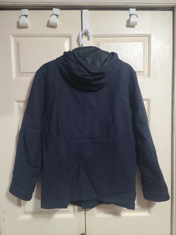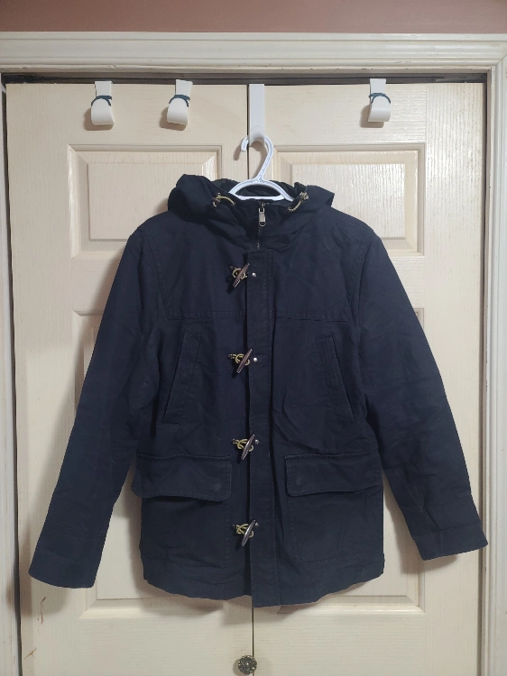 124Black hooded jacket with a zipper and toggle closures. Two front pockets. Haven't use it since last Fall. I just pulled it out of a vacuum sealed bag. Pick up near BCIT Burnaby