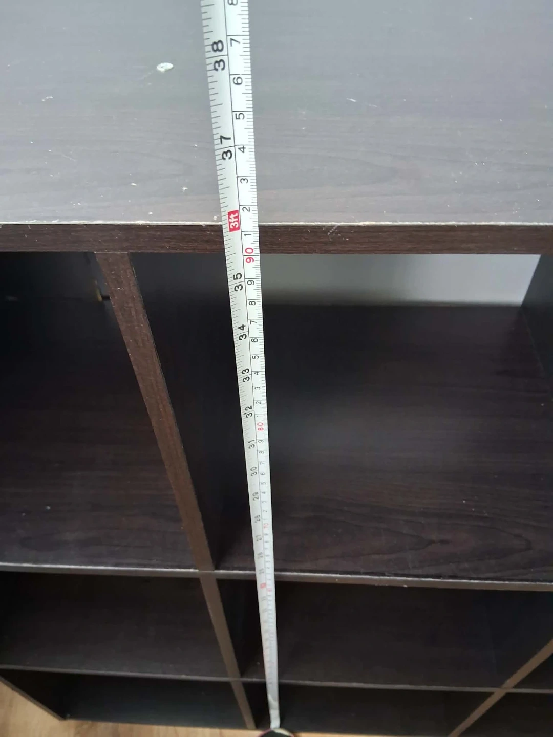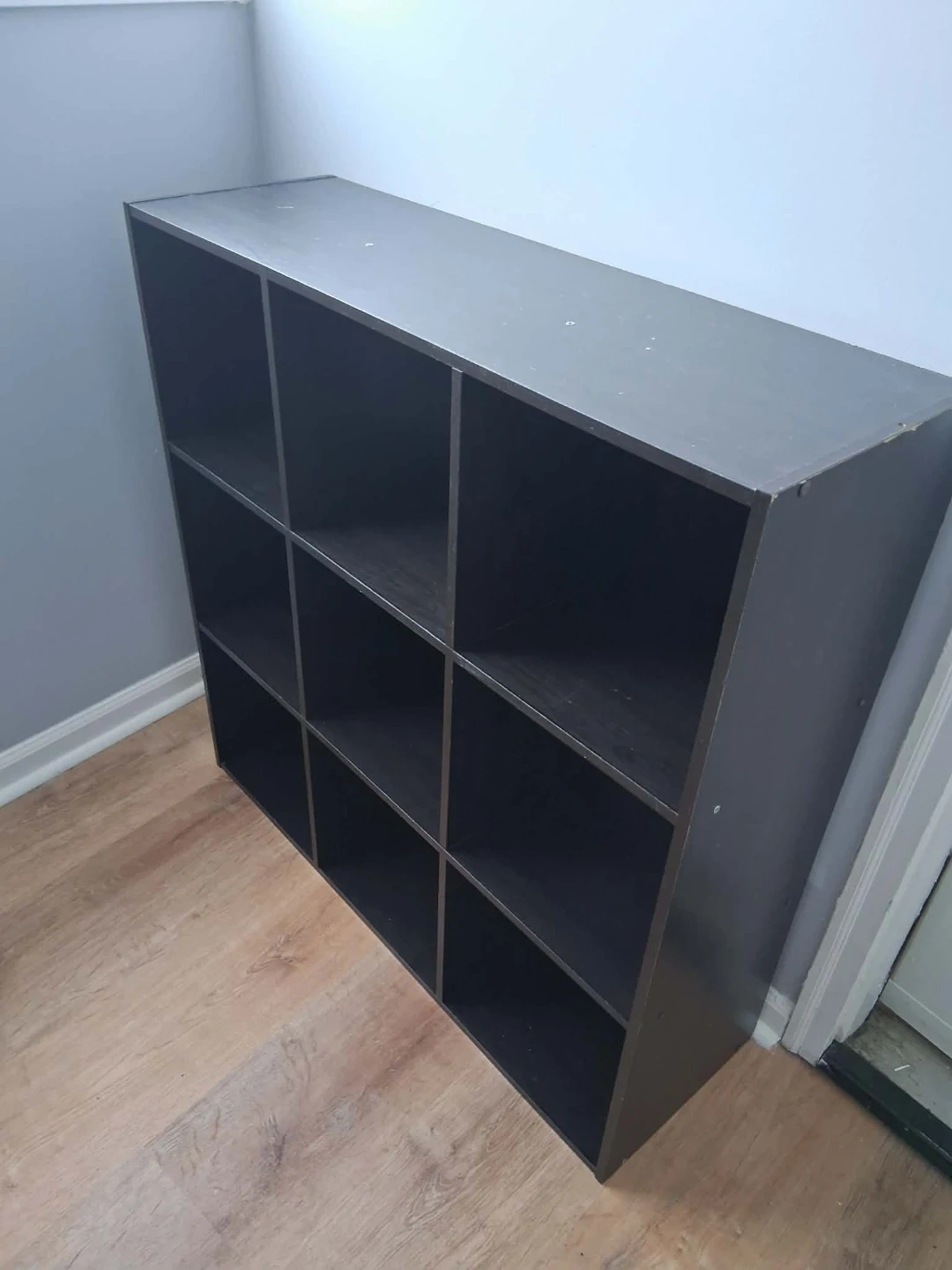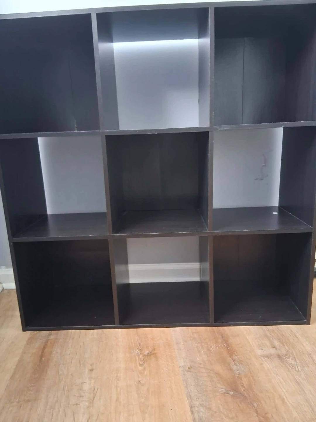 Dark brown cube storage unit with 9 individual cubbies. Measurements are approximately 38" H x 30" W x 12" D. It's a versatile unit for organizing books or display items!