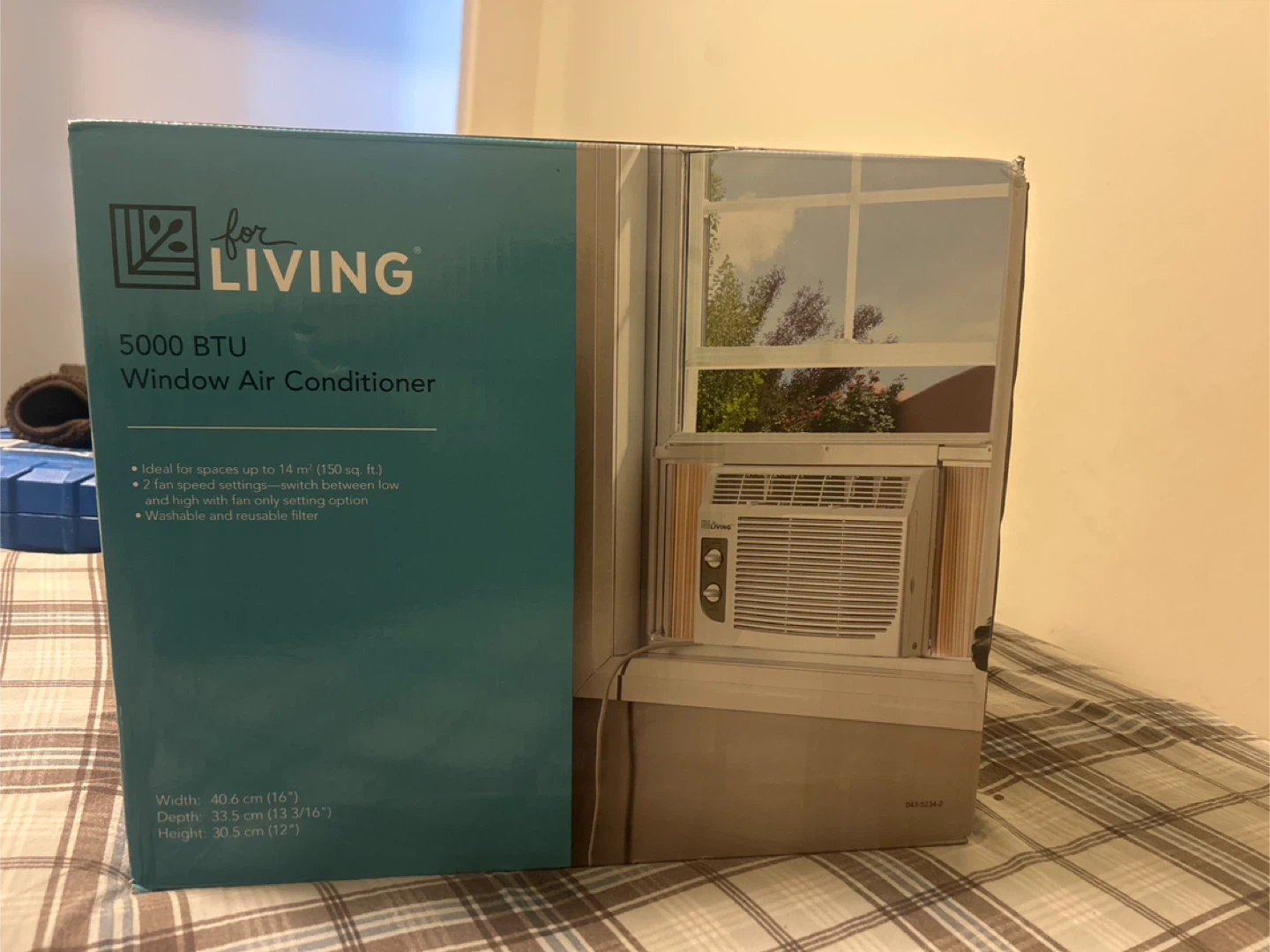 This For Living window air conditioner is ideal for spaces up to 14 square metres. It features 2 fan speed settings and a washable, reusable filter. The unit's dimensions are 40.6 cm width, 33.5 cm depth, and 30.5 cm height.