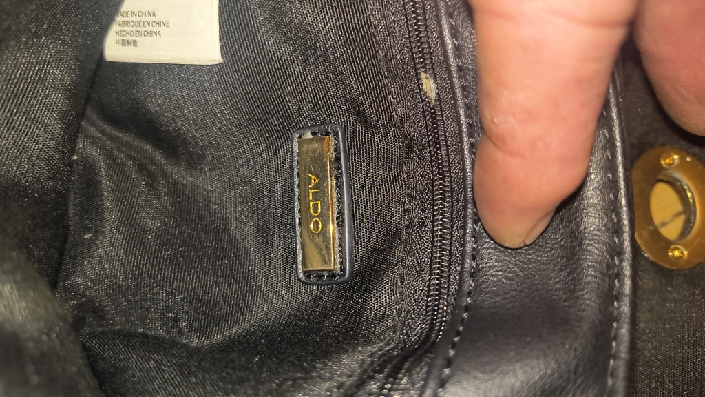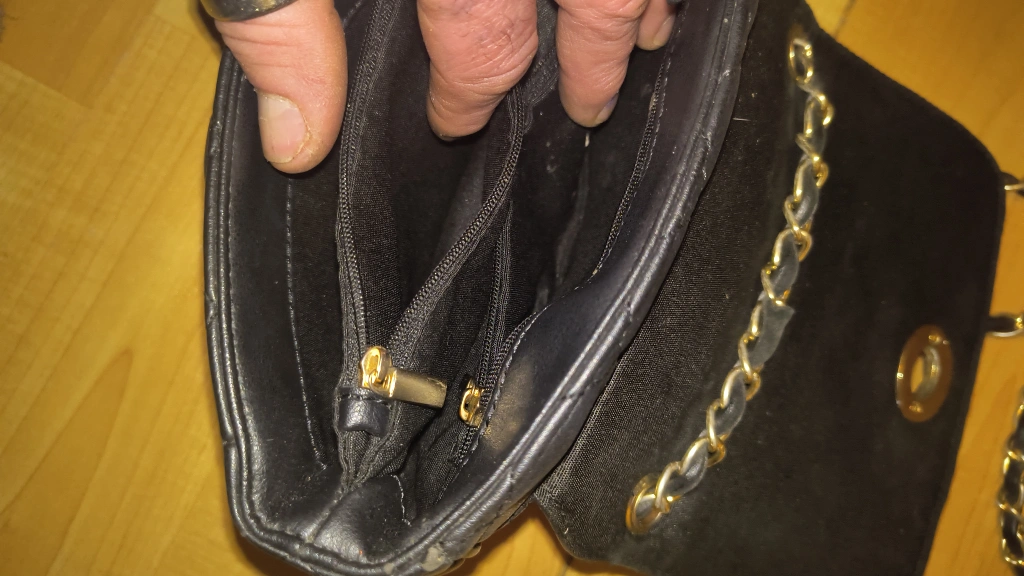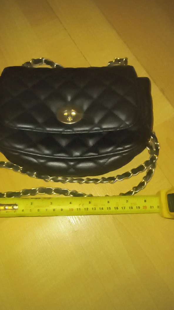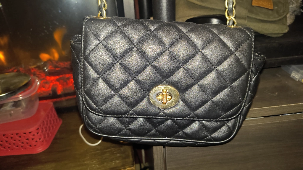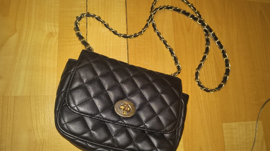 Small black quilted purse with a gold chain strap. The purse has a zipper closure and a small pocket on the inside.