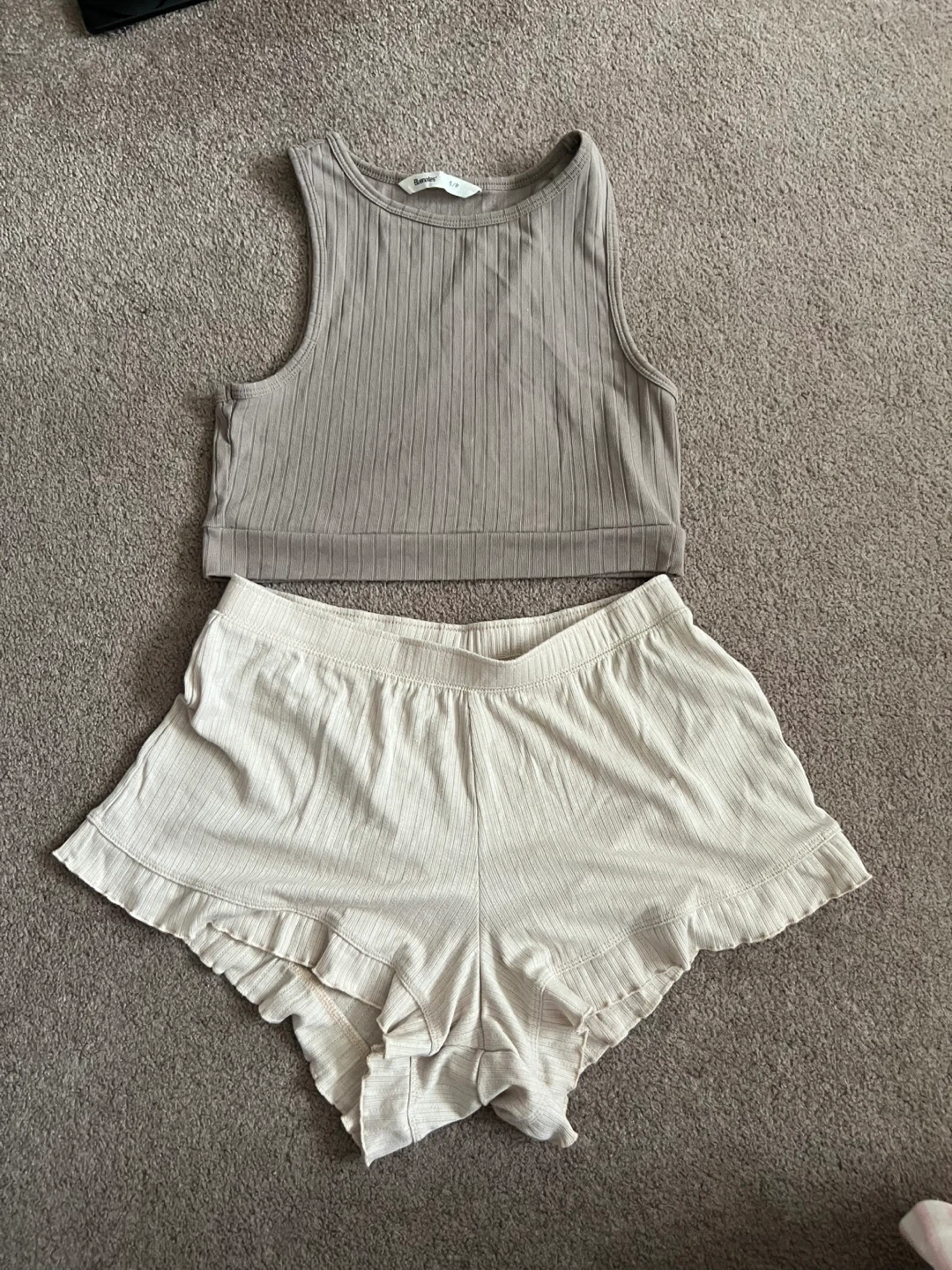 Selling a cute and comfy two-piece set from Buenotes! It includes a ribbed tank top and matching shorts, both in size small. Perfect for lounging or a casual day out