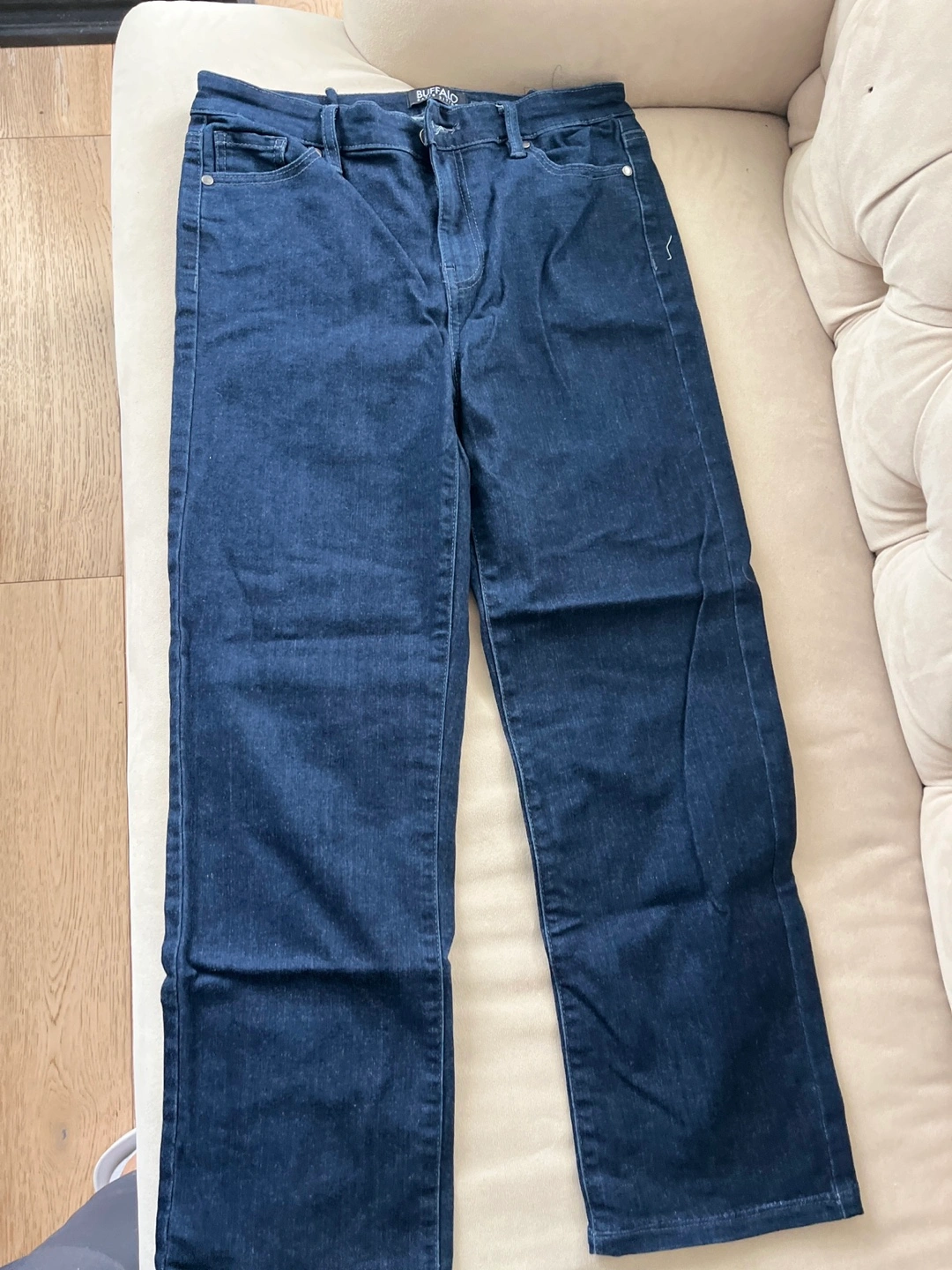 Dark wash straight leg jeans. High rise. It was stitched because I lost weight but easy to take off. Just wear couple of times.