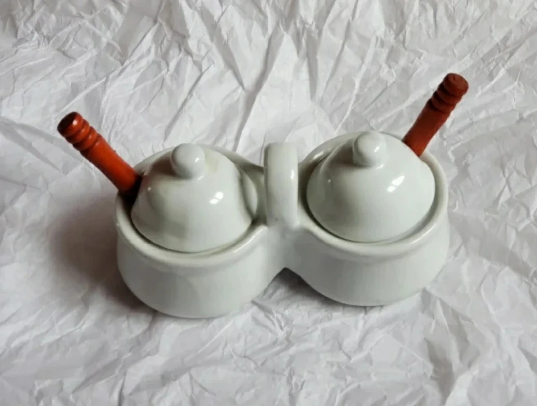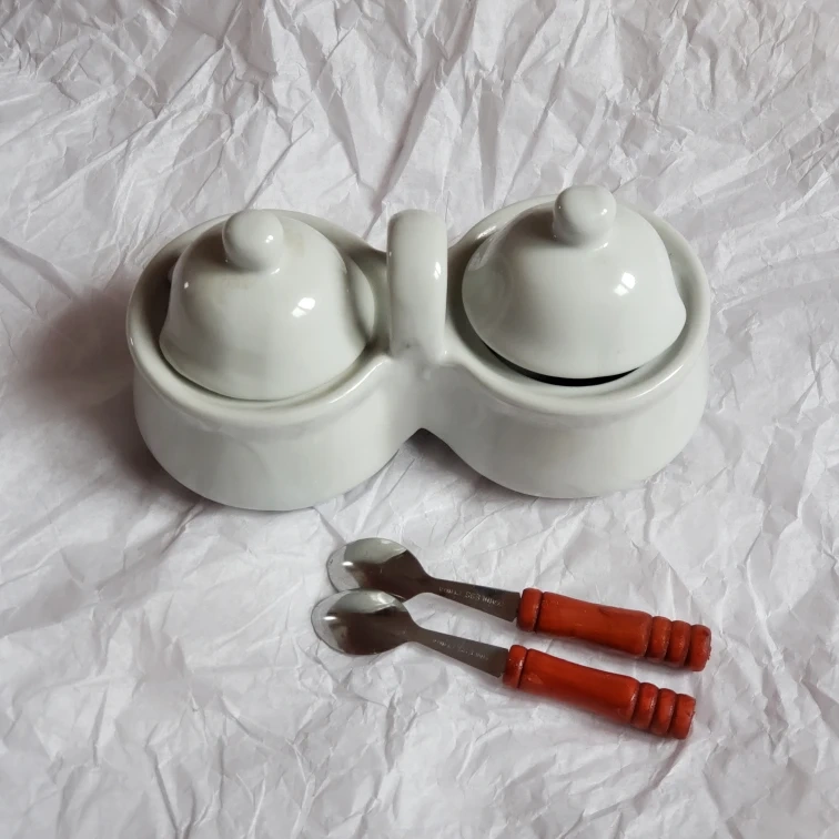1000+Double ceramic jar with lids and two spoons Great for sugar, honey, jam, or other condiments Approx. dimensions: 16 x 7.5 x 8cm Rarely used and in good condition Hoping the item finds a new home! From a smoke-free & pet-free home Cash only & exact change All sales are final; no refunds or reservations Pick-up only Location: Richmond Hill Serious inquries only; messaging only through Karrot Thank you for your interest & please check my 200+ listings for more!