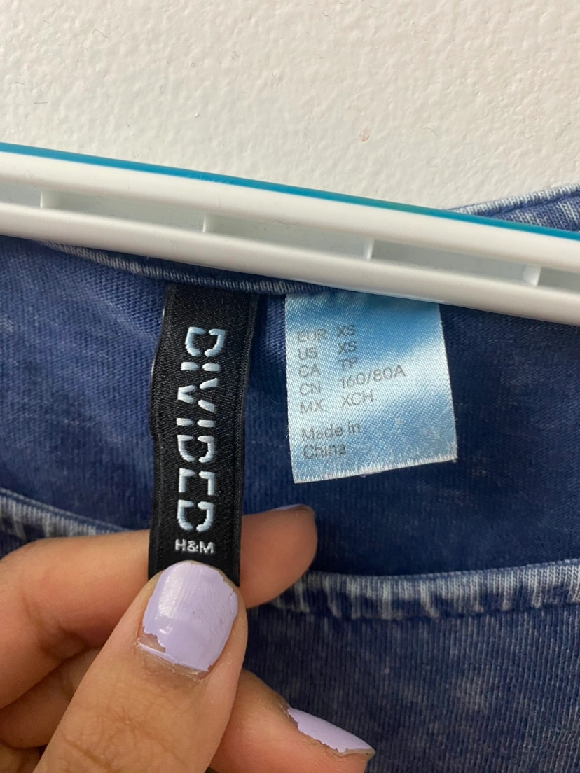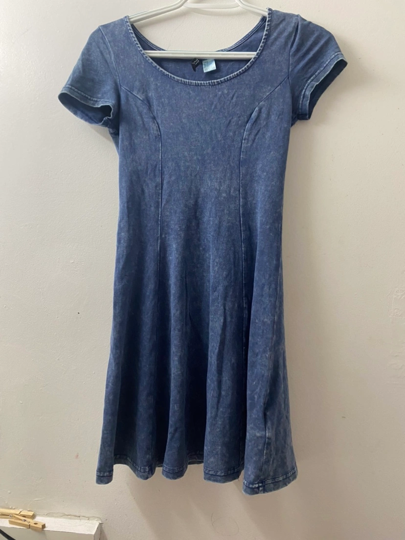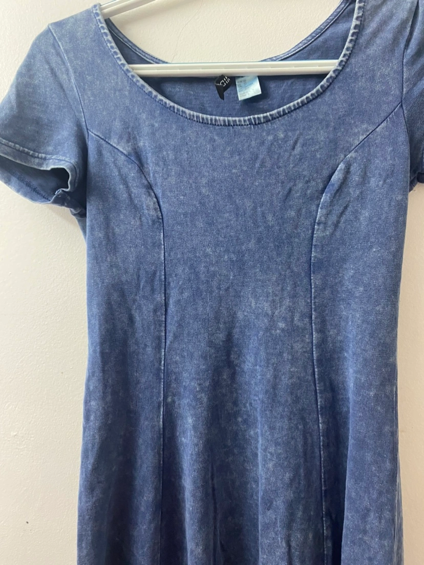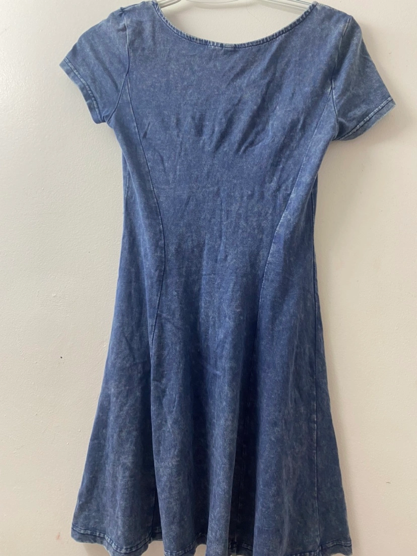 1000+Blue denim dress with short sleeves and a scoop neck. Fits like a size XS but stretches to an M