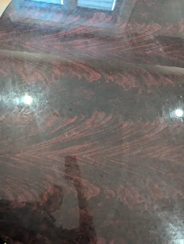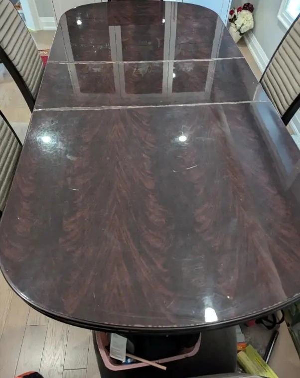 *Italian dining table* 86 in x 42 in Inner leaf is 16 in Height of table is 31 inches Burgundy color Table has laminate peeling on edges; It has no color loss
