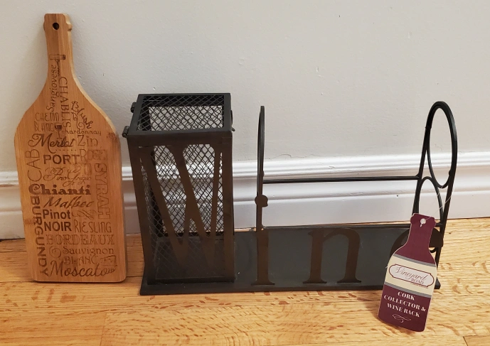 Nice Wine Rack with handles and cage to collect corks. Would be great to display on bar or middle of table. Serving board in shape of wine bottle has names/types of wine written on it. Great Father's Day gift