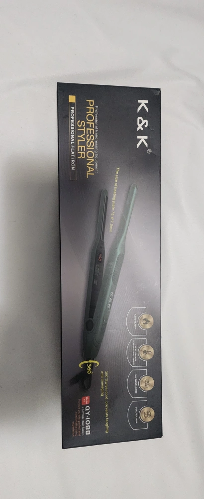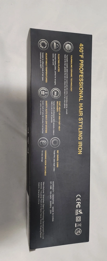 450°F Professional Hair Styling Iron. Features tourmaline ceramic technology, floating plates, adjustable temperature, fast heat up, safety shut-off system, 360° swivel cord, heat-resistant comb, and a long cord.