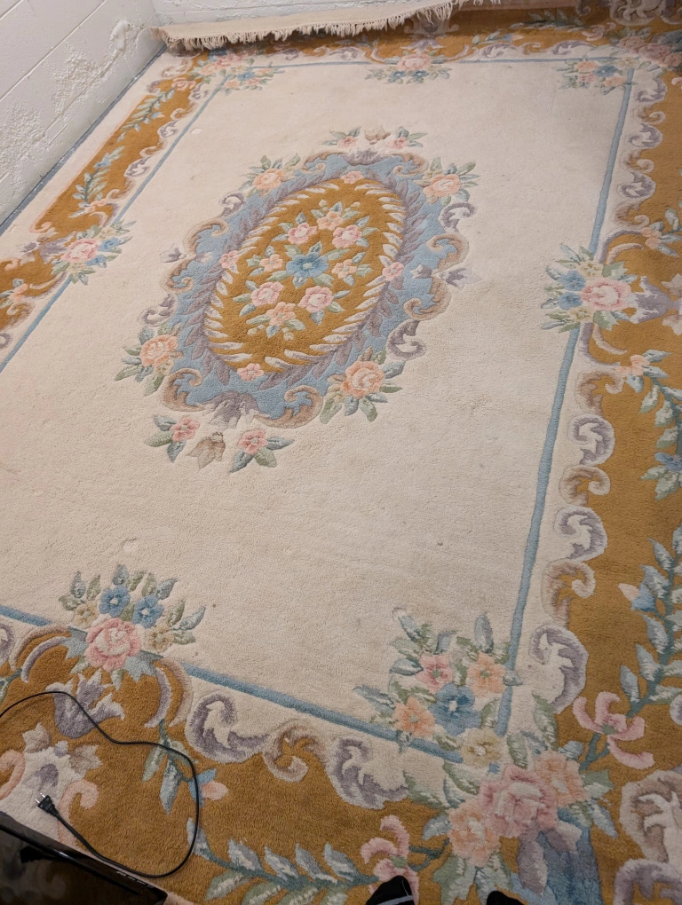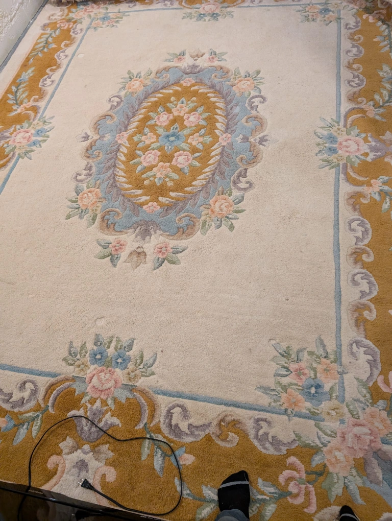 Large floral area rug. Off-white with gold and light blue accents. Measures approximately 8ft by 10ft. extra worm just not needed two large for my space made out of wool very sturdy thick carpet well made.