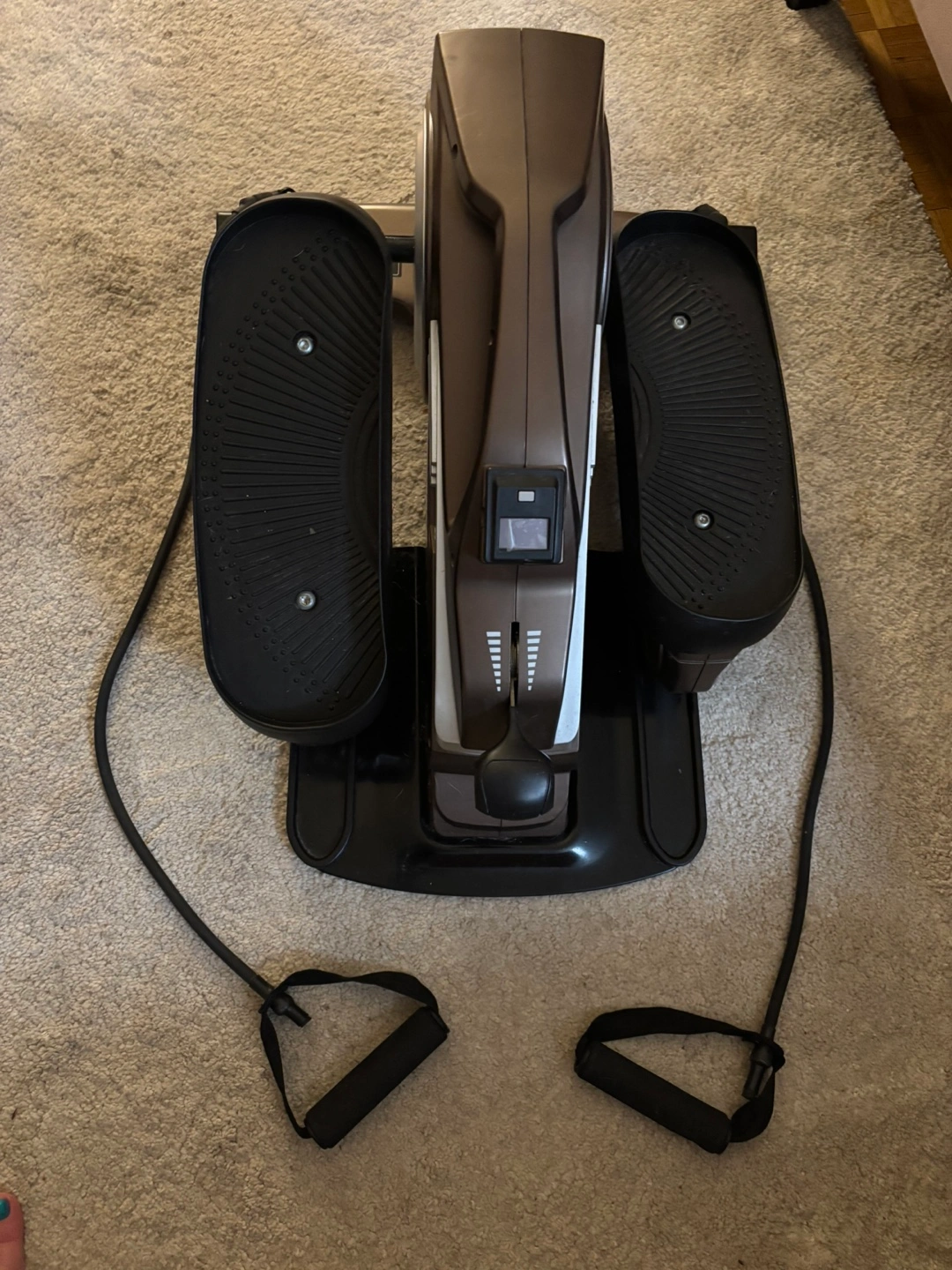 Elliptical trainer, compact and portable. Includes resistance bands.