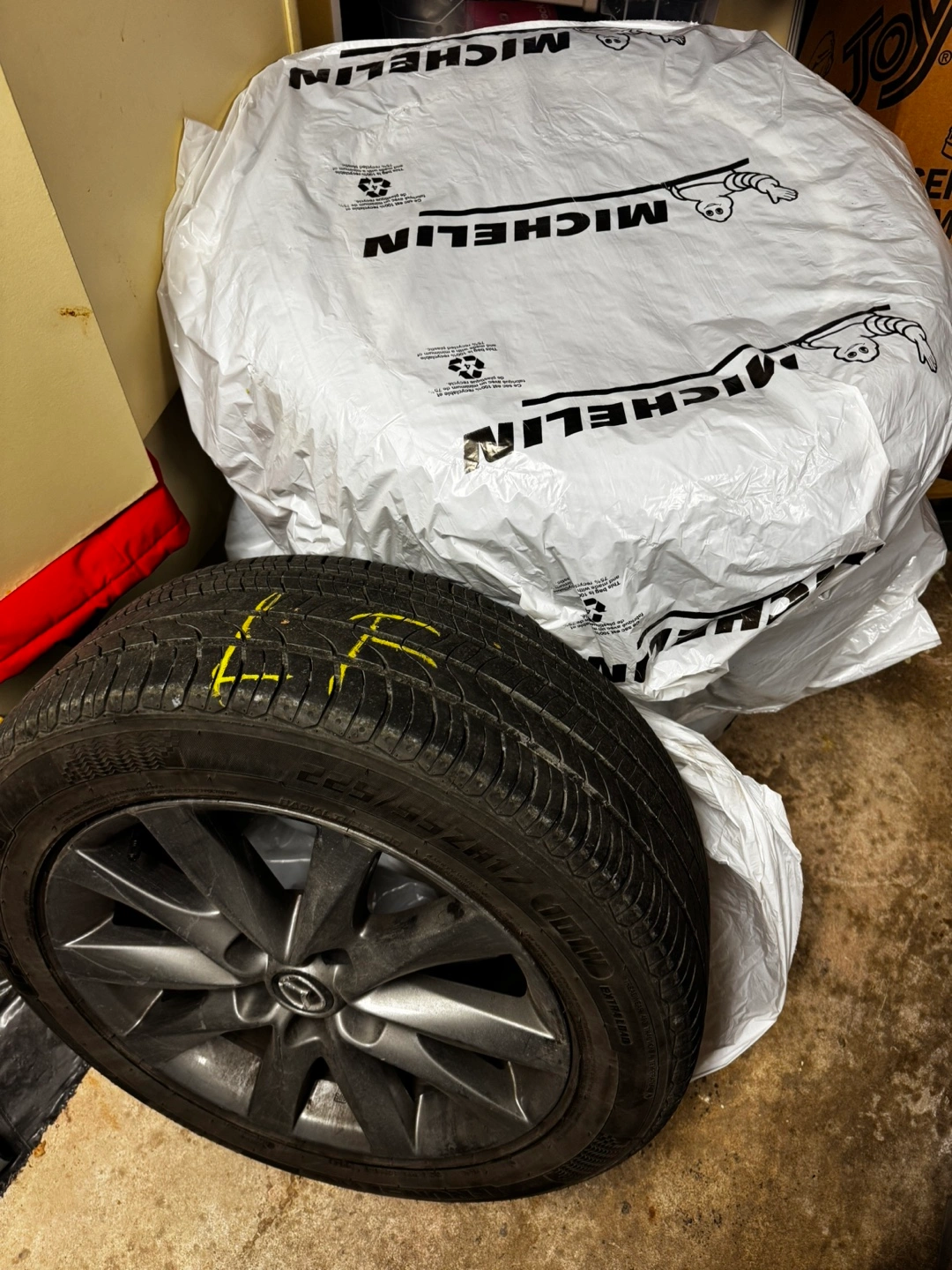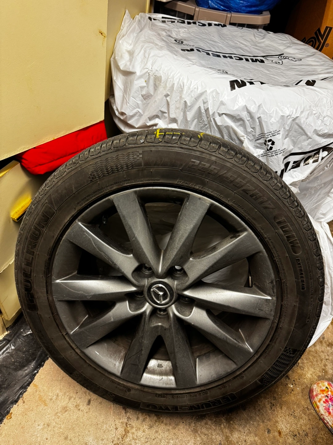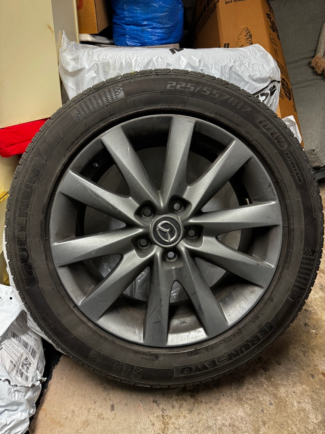 17 inch alloy wheel and tire. Full Run tires with good tread remaining. Grey alloy wheel. No curb rash. 225/55/R17. 2023