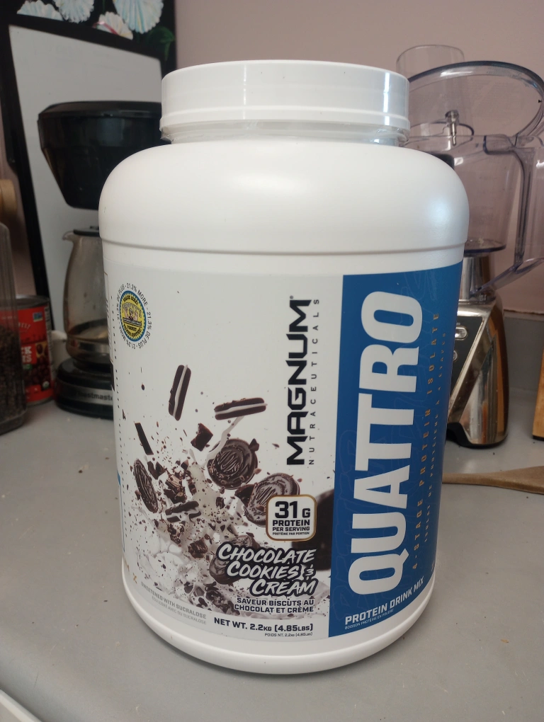 1000+2.2kg tub of Quattro Magnum Chocolate Cookies & Cream protein powder. 31g of protein per serving.