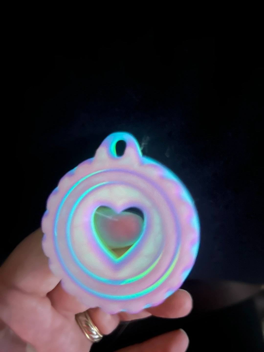 Glow in dark fidget toys. Each is a round, iridescent charm with a different design in the middle. Designs include a heart, a cross, a smiley face, and two geometric shapes. Each charm has a small loop at the top for attaching to a keychain. Can be custom colour also - as per availability. Awesome portable fidget to go anywhere with you for your special needs, kiddo. These particular fidgets are quite robust and put up with a great deal of abuse.