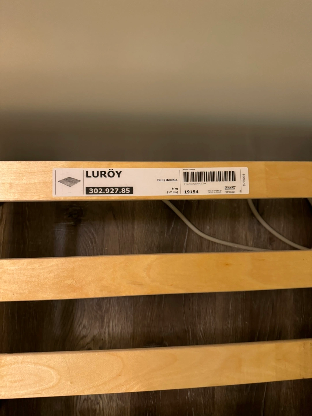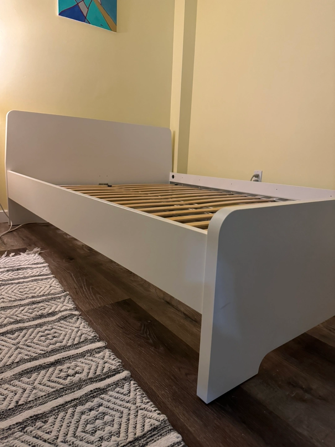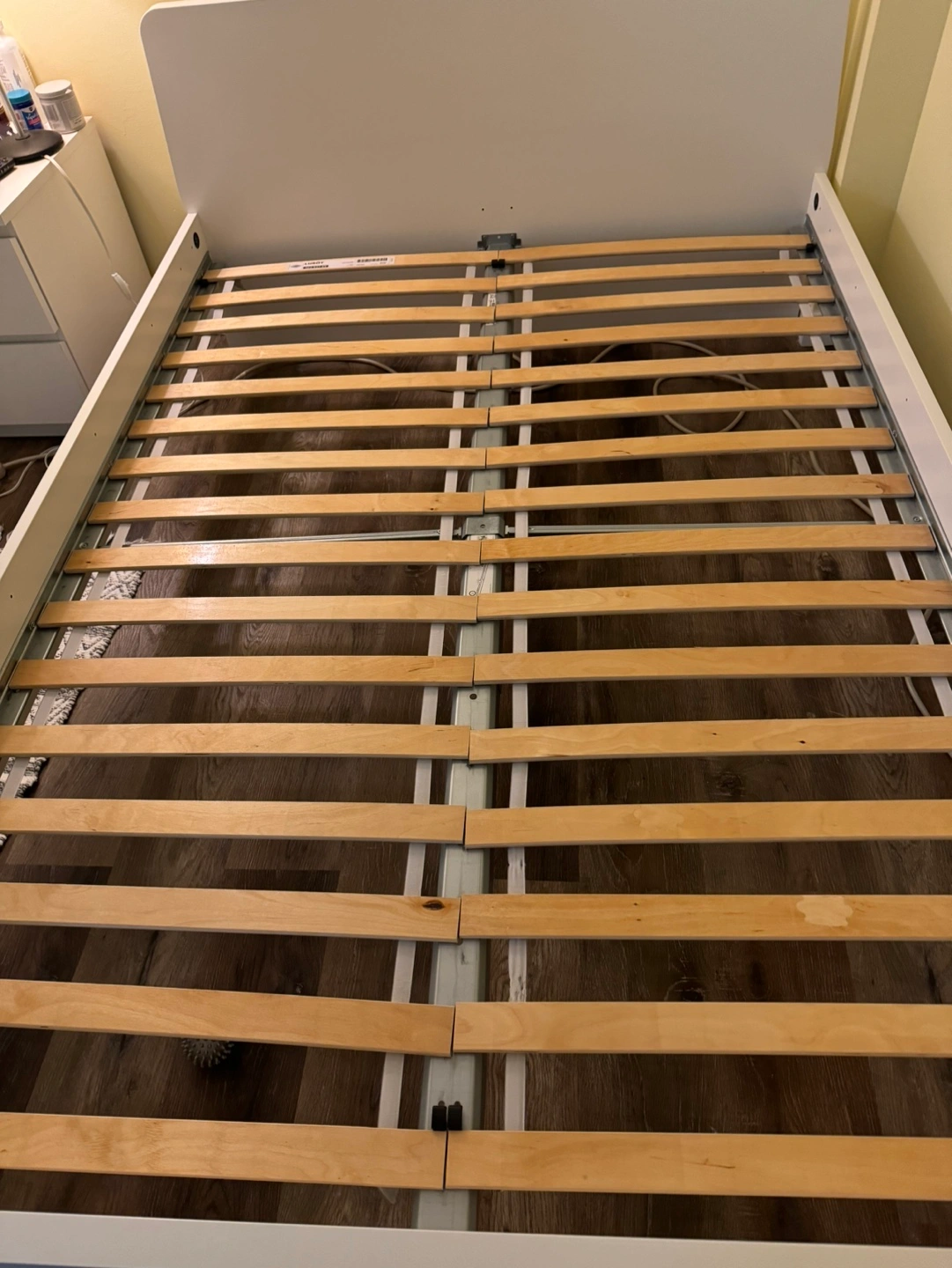 White double bed frame, includes slats. Good condition, no major scratches or damage. Pick up only Monday to Friday after 6:00 Pm or weekends any time.