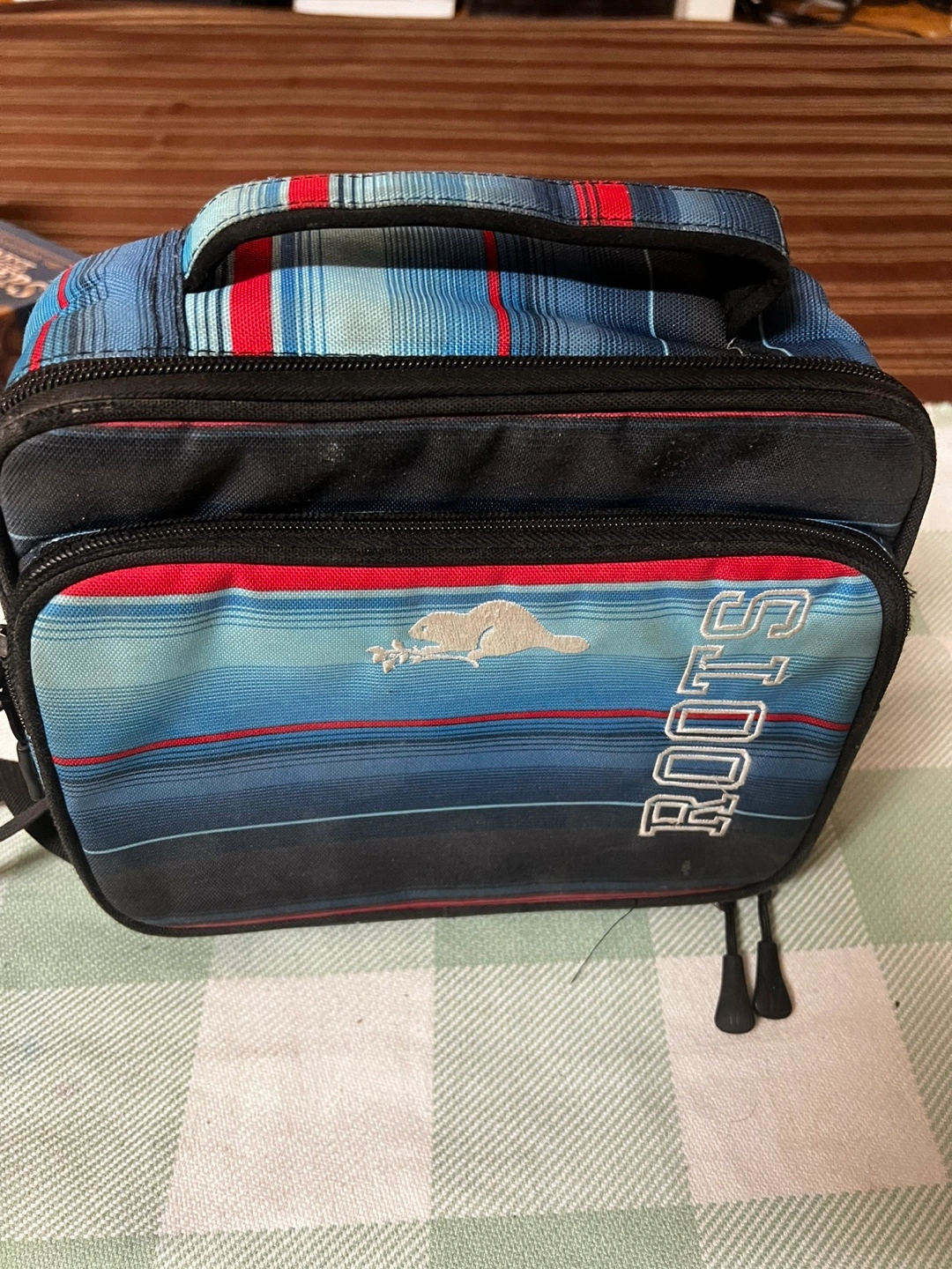 Like new Lunch bag with a shoulder strap. Insulated interior. Blue, red and black striped pattern. Good condition.