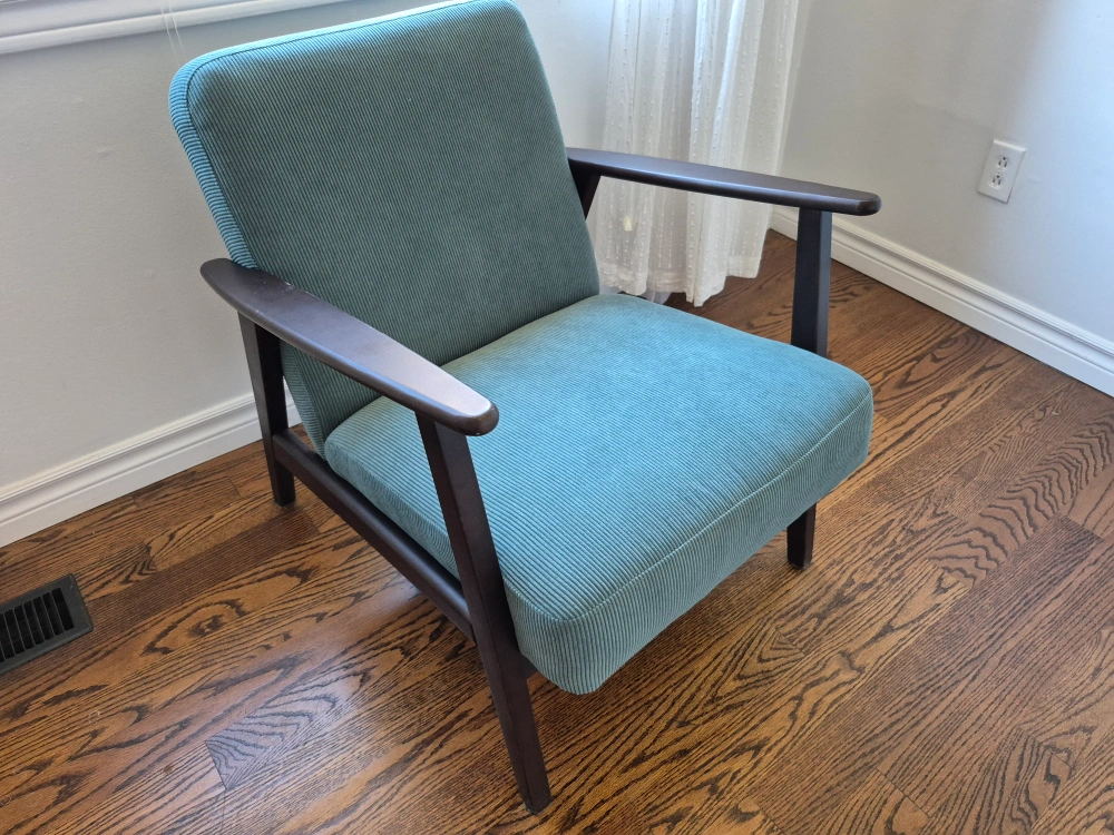 the EKENÄSET armchair with a dark wood frame. this piece adds a stylish retro vibe to the room