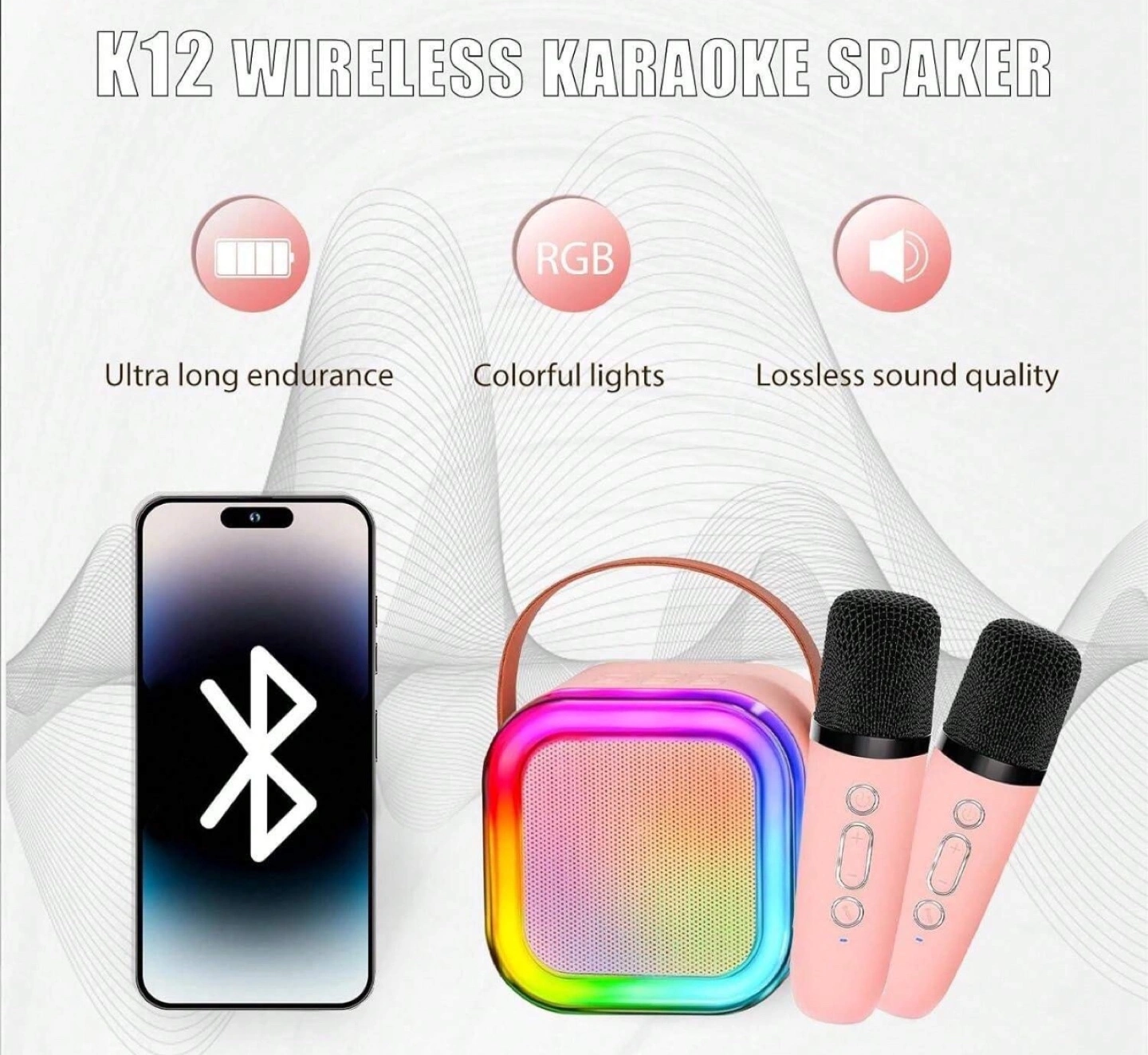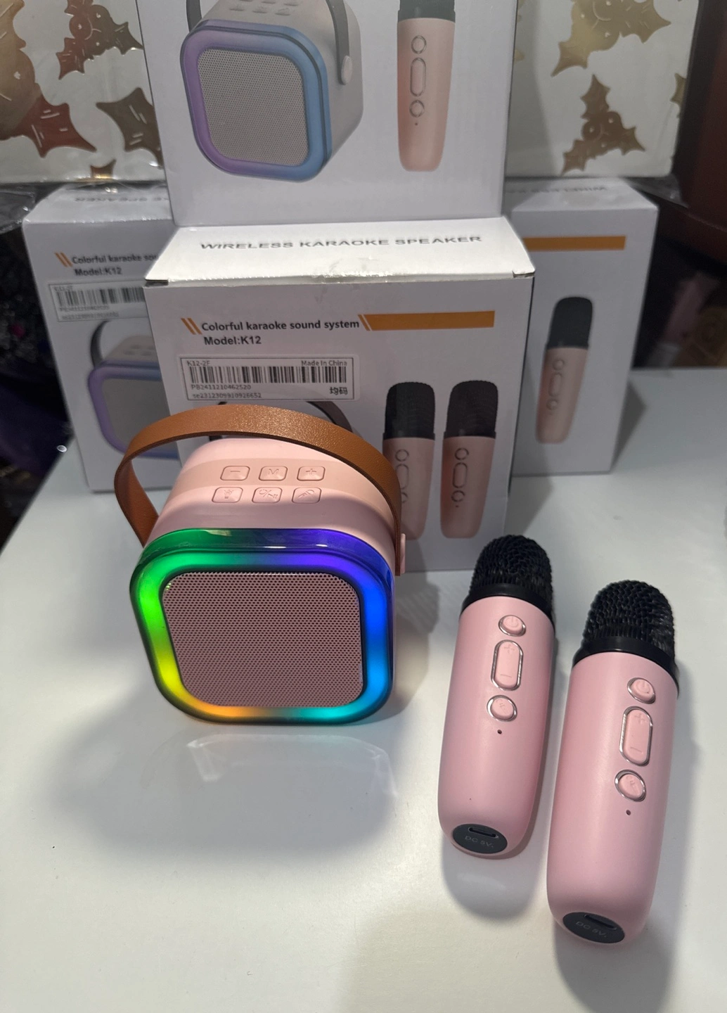 Wireless karaoke speaker with two microphones. Features lights, long battery life, and good sound quality.