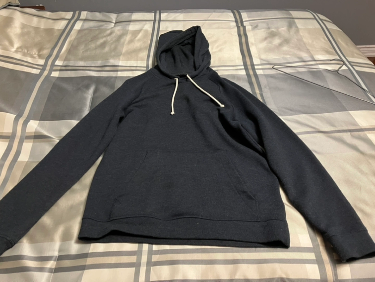 Men’s H&M small hooded sweater for sale. It’s a fitted navy blue sweater, and has no damage or wear whatsoever. The shell is 61% cotton and 39% polyester, the hood lining is 60% cotton and 40% polyester, and the rib is 58% cotton, 38% polyester and 4% elastane