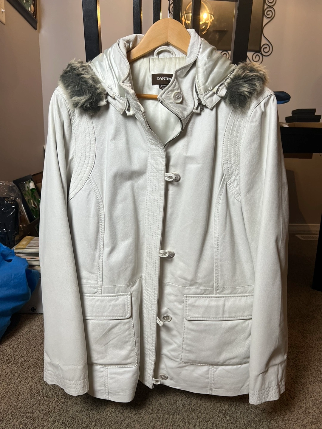 White leather jacket with faux fur trim on the hood. Size XL. Snap and zipper closure.