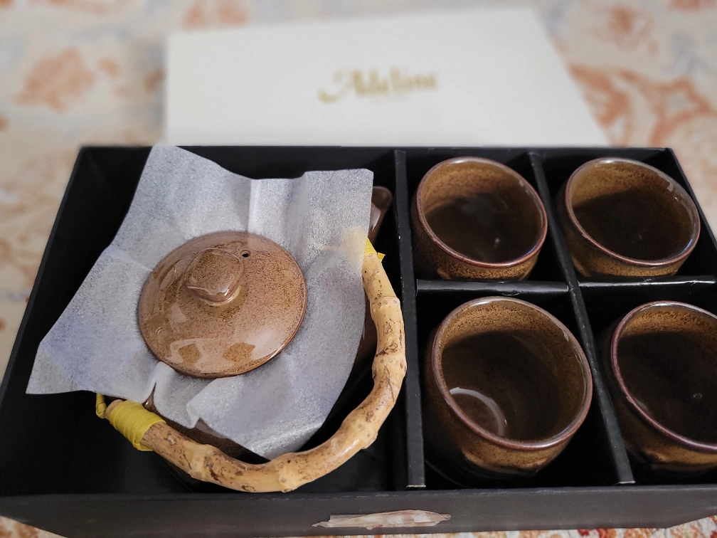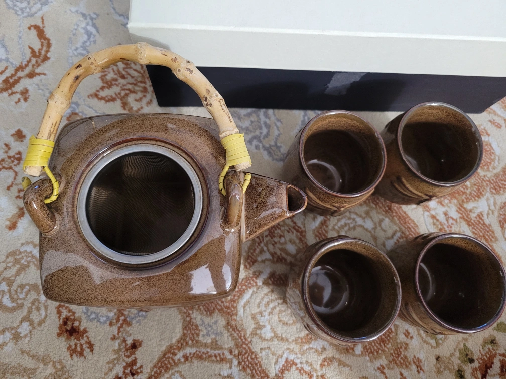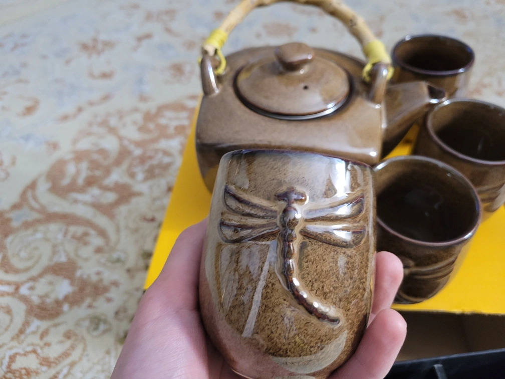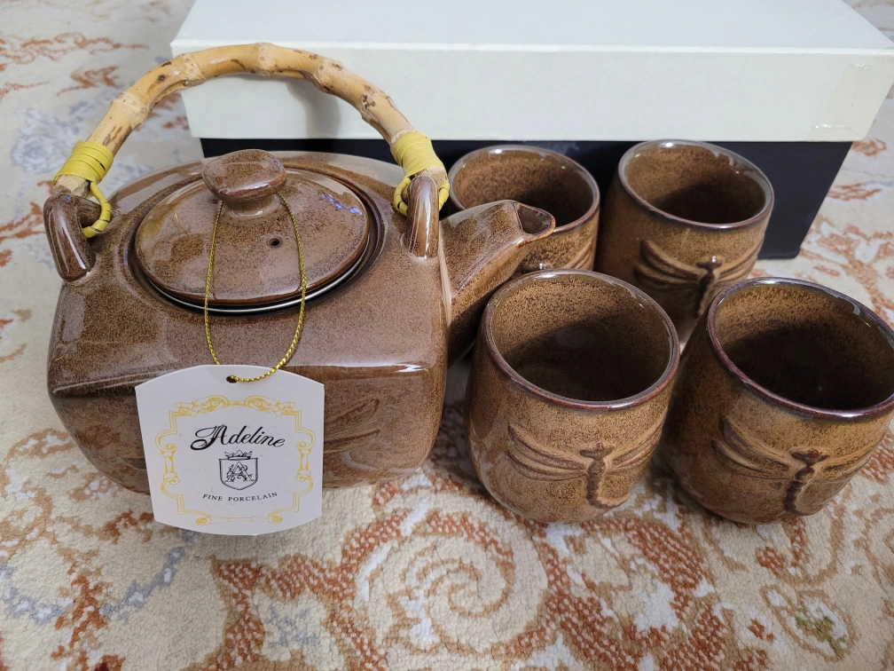 Tea set with brown glaze. Includes one teapot with a bamboo handle and four teacups. Each piece features a dragonfly design.