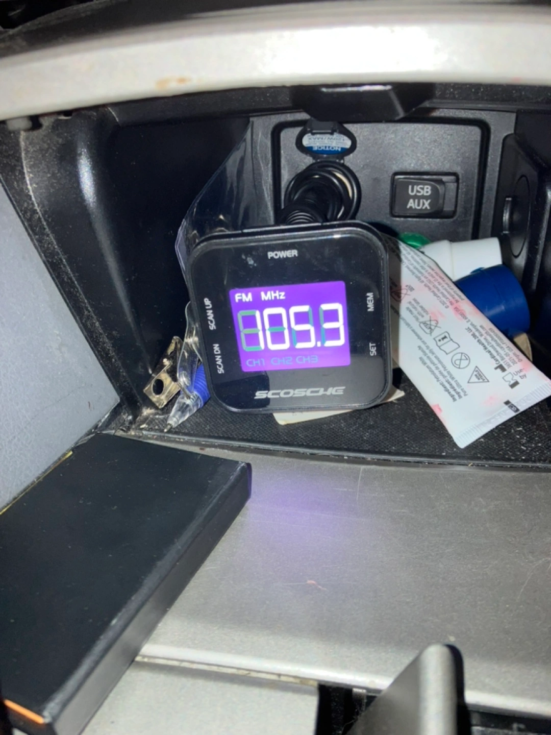 Scosche car FM transmitter for sale, model number FMTD3. Comes with an auxiliary cable attached that connects to your mobile device to play audio from your device on the car stereo. Located in Thornhill, Ontario near Bathurst and Centre street, only a couple minutes north of Toronto