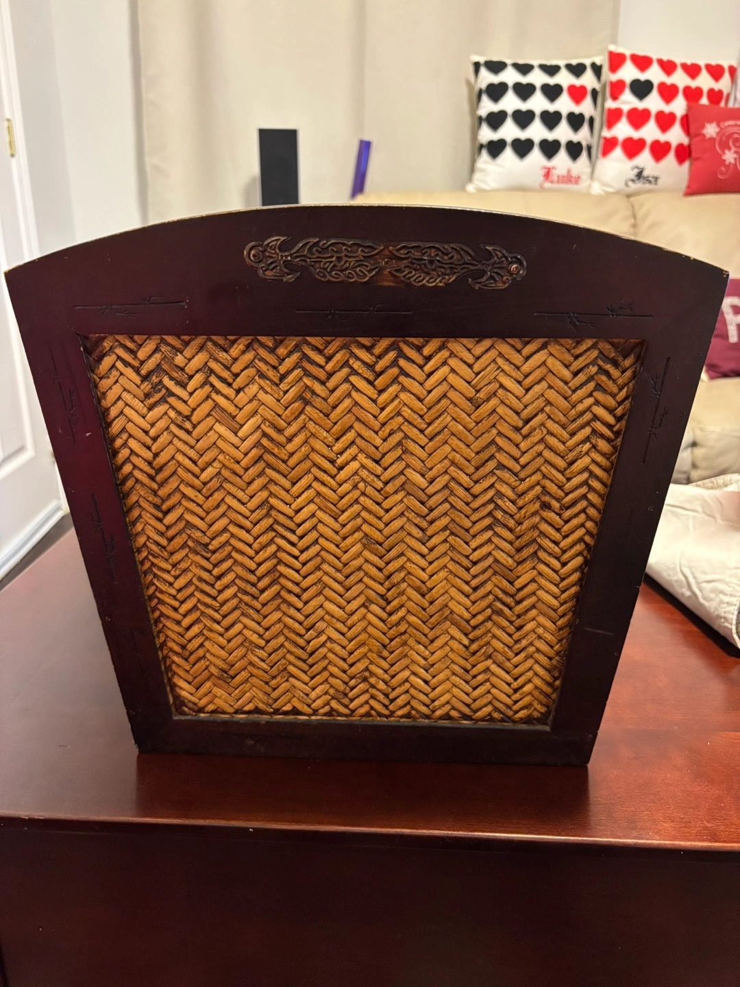 Wooden Wicker storage basket with a dark brown wooden frame. It has a woven pattern with carved details on the front.