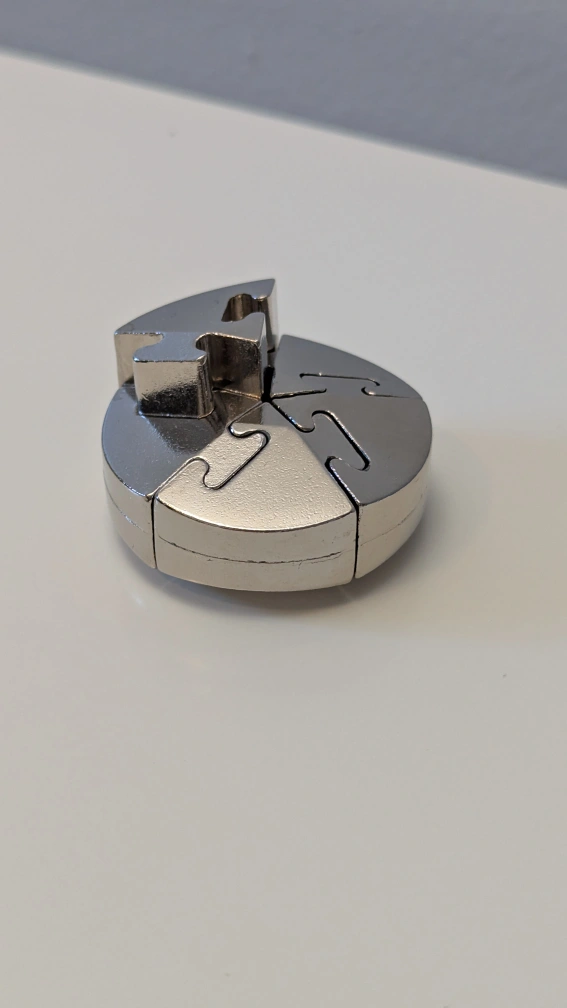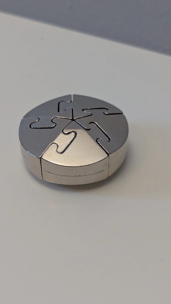 Small metal puzzle, approximately 2 inches in diameter. It consists of five interlocking pieces. No box.
